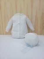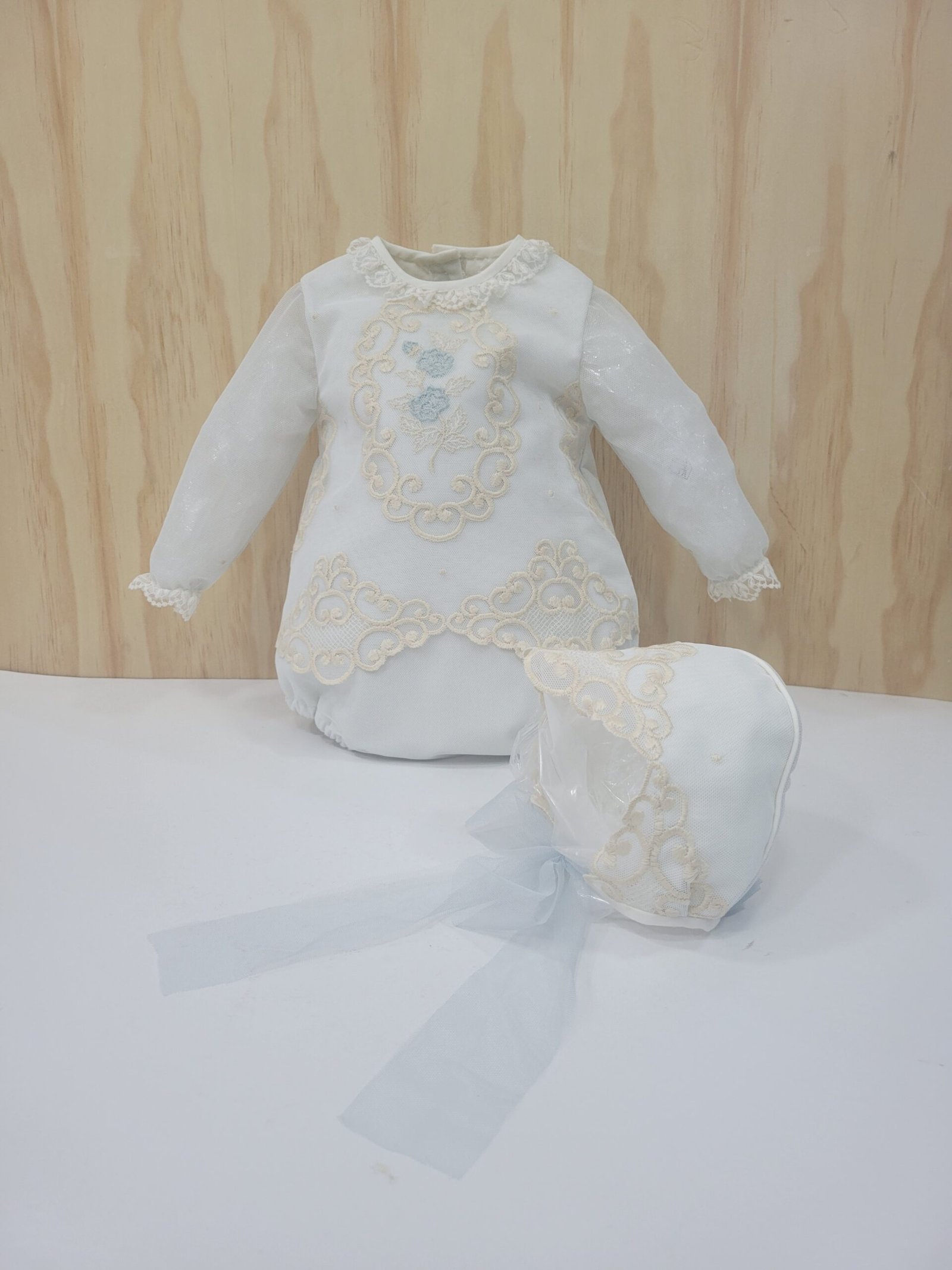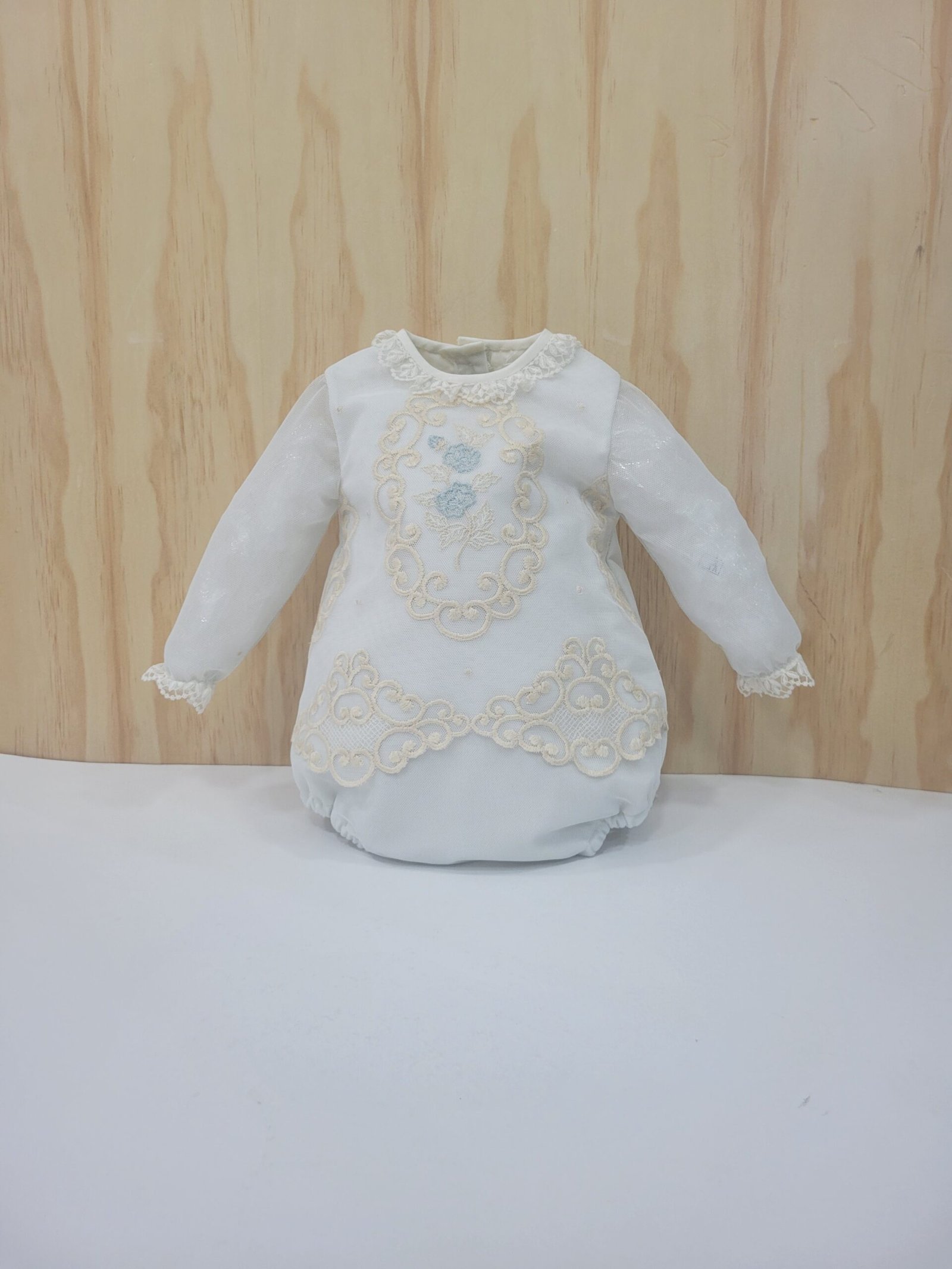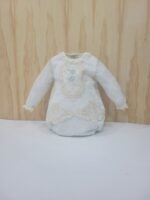 Ajuste: Mangas compridas em tule, gola redonda, e botões para facilitar o vestir na parte traseira e inferior, capota incluída