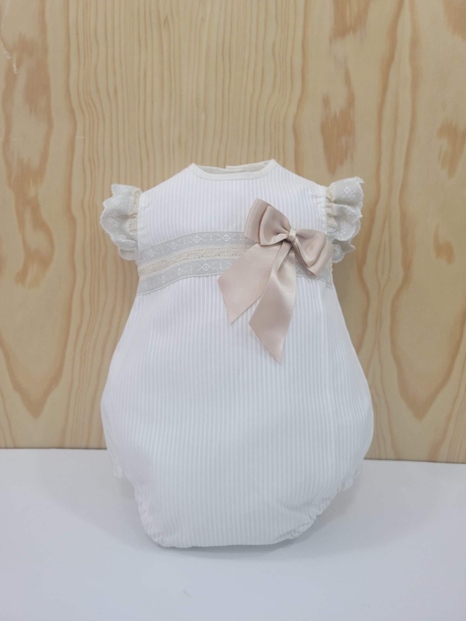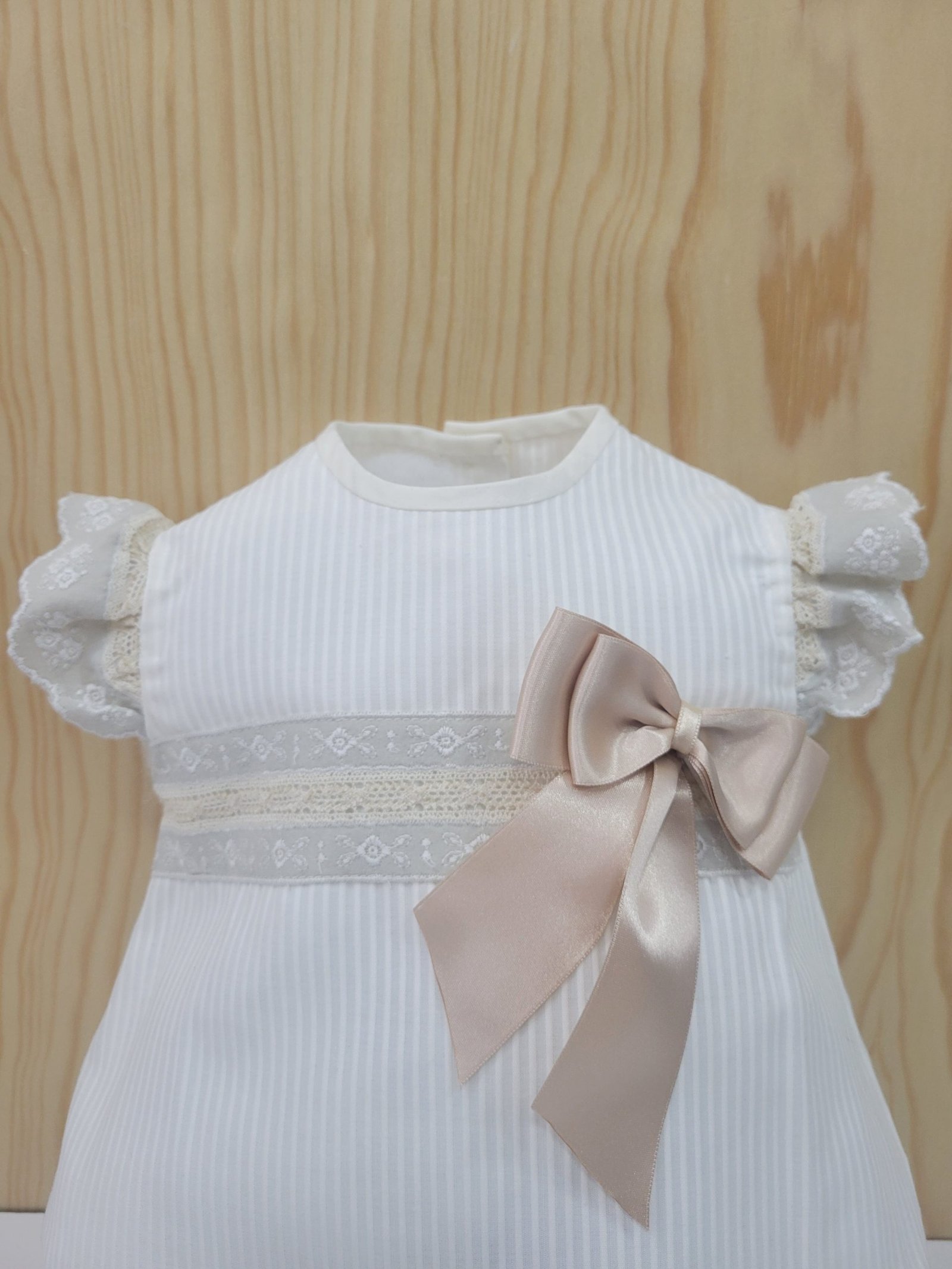 Design: Design simples com listras bicolor, bordado central e laço decorativo