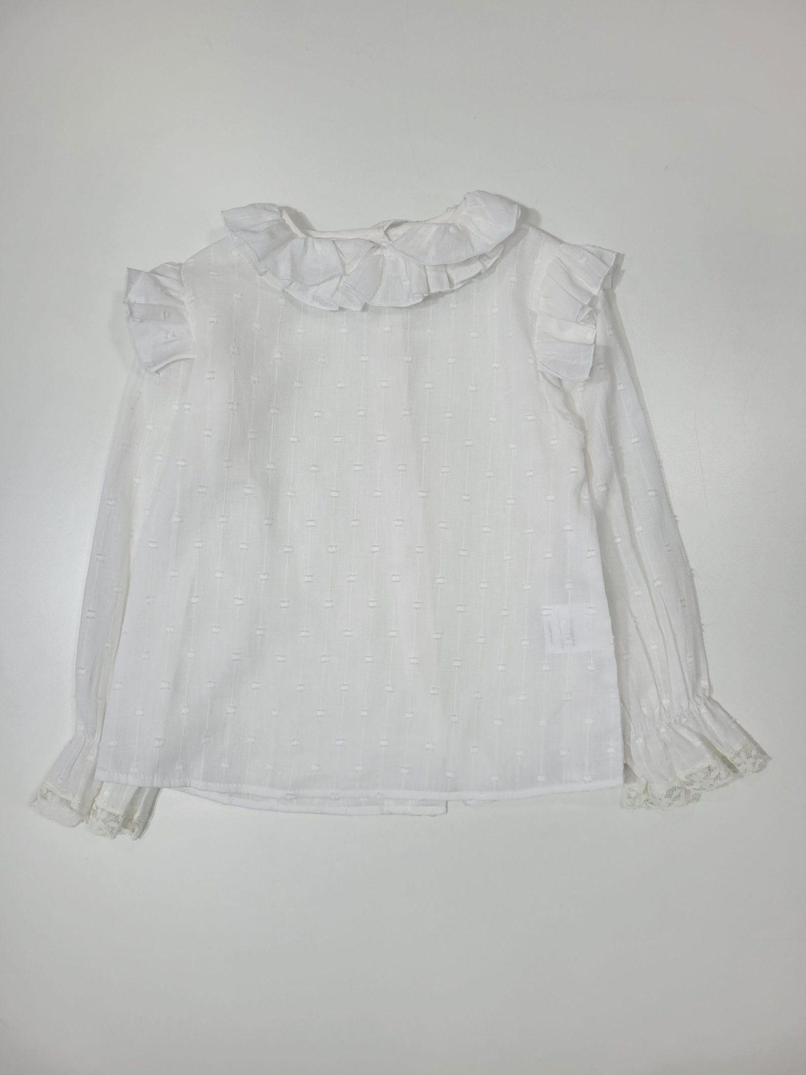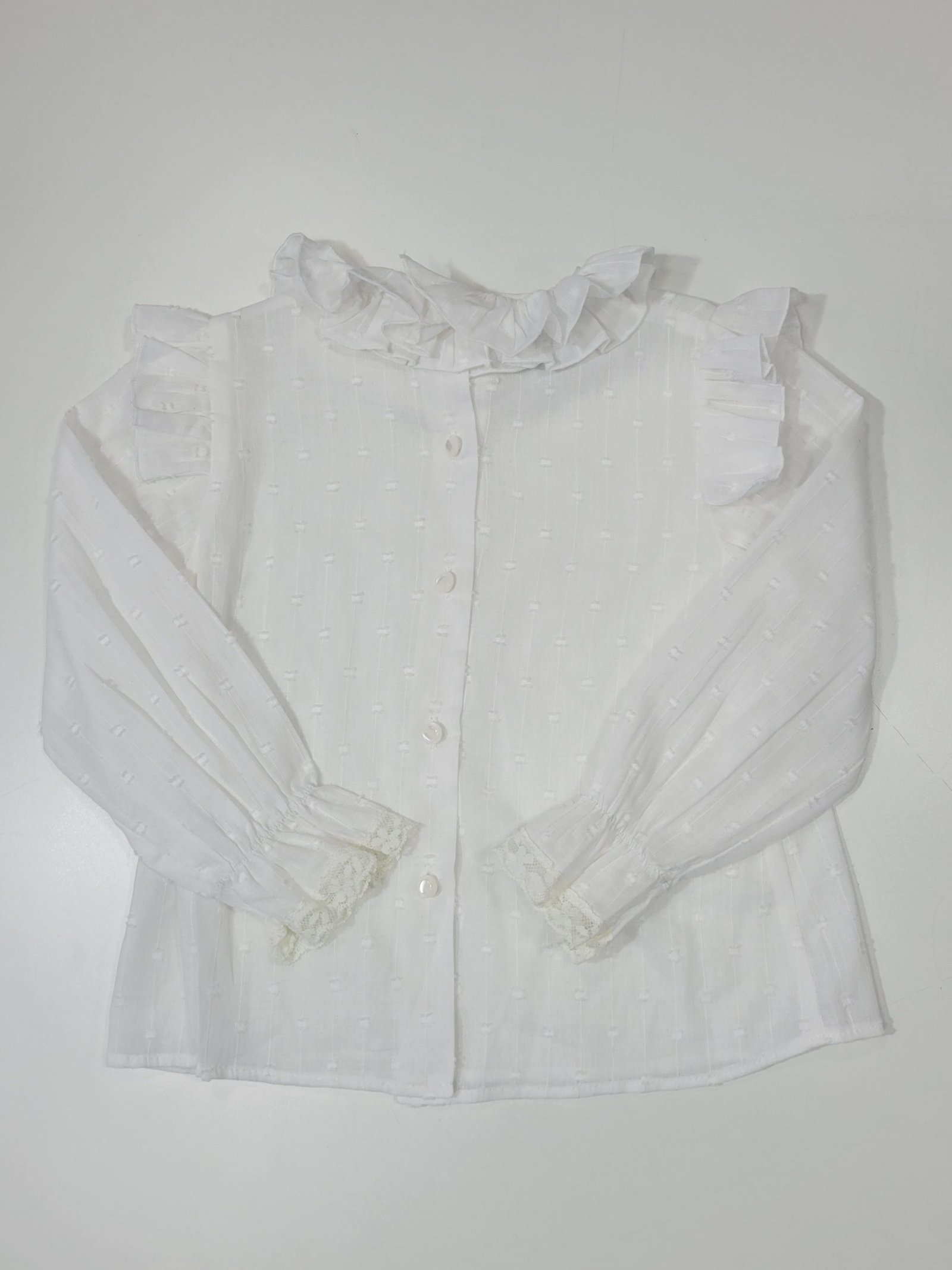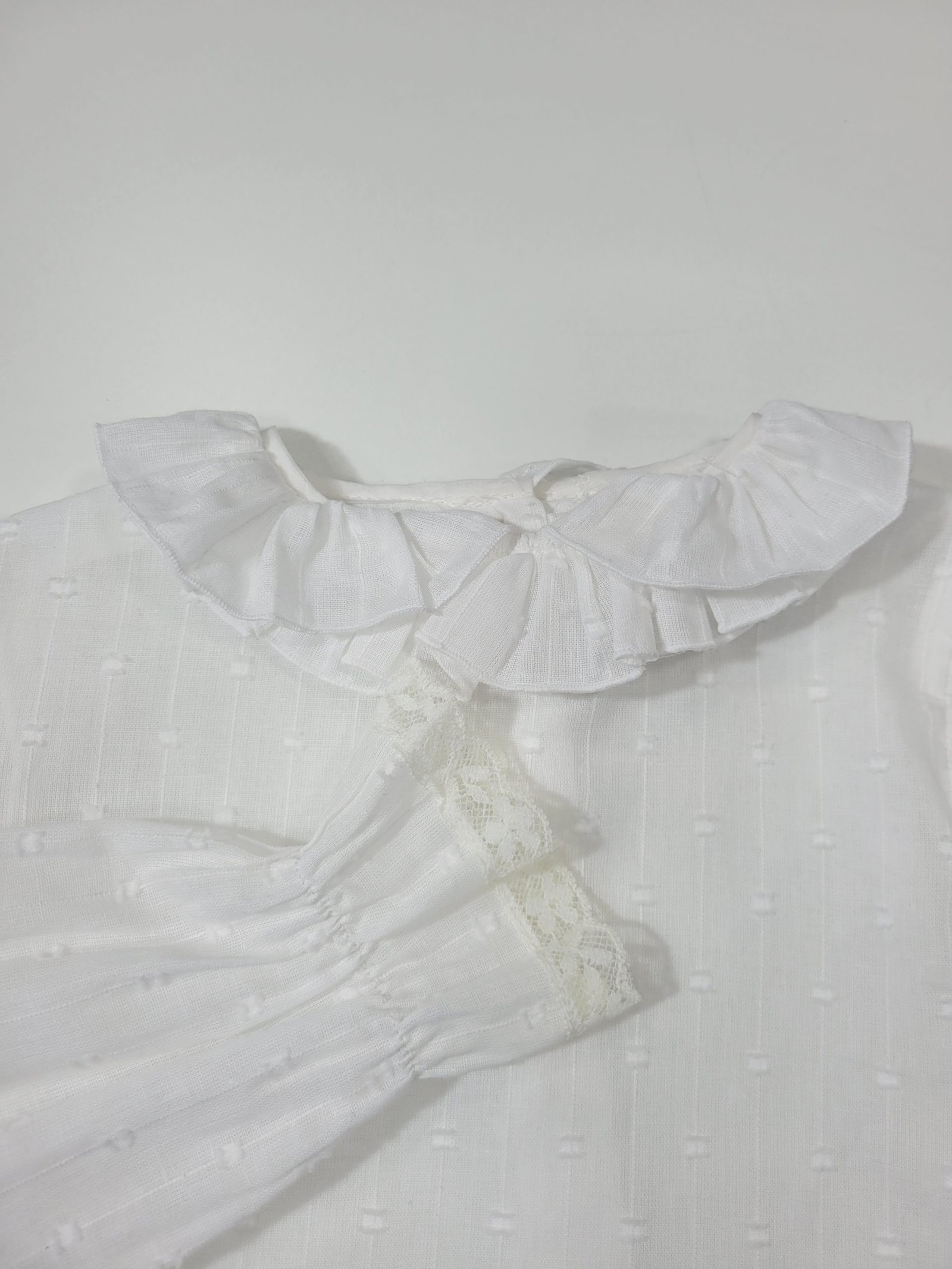 Design: Apresenta padrão pontilhado súbtil com detalhes de folhos e renda nas mangas e gola