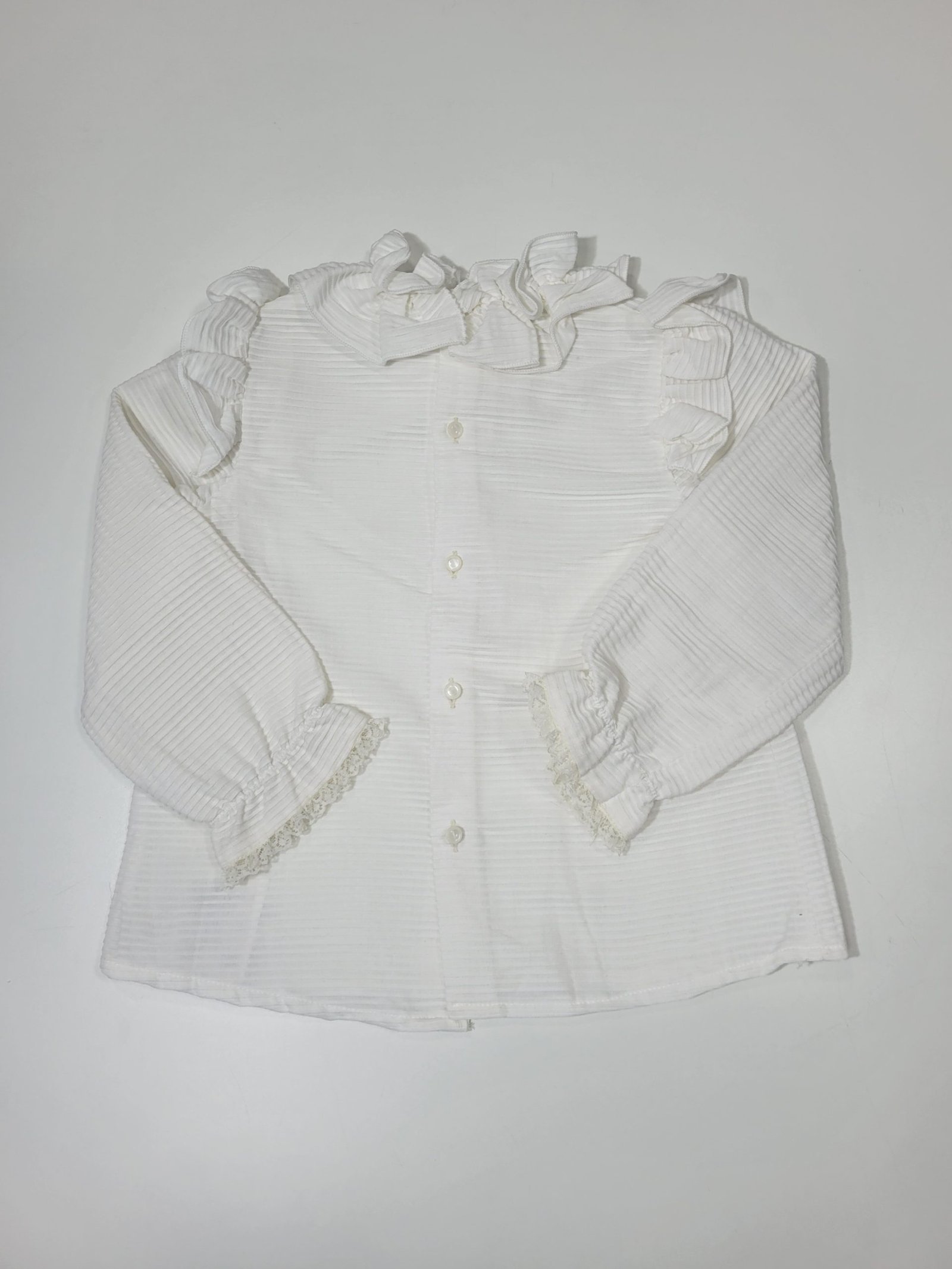 Design: Apresenta listras súbtis com detalhes de folhos nas mangas e gola