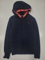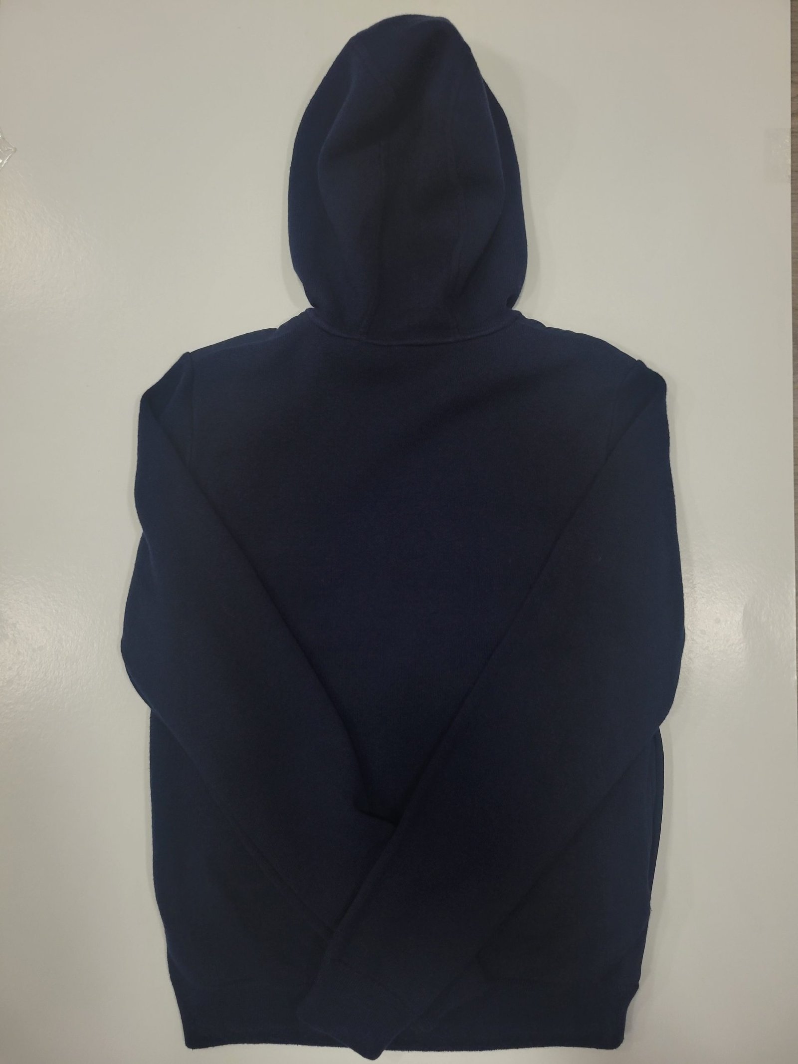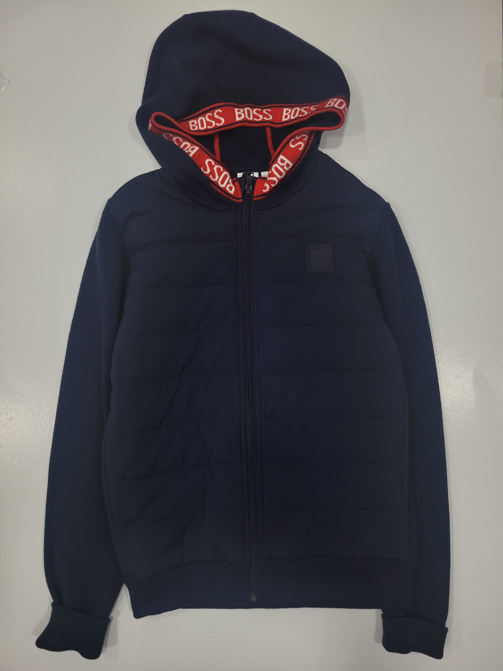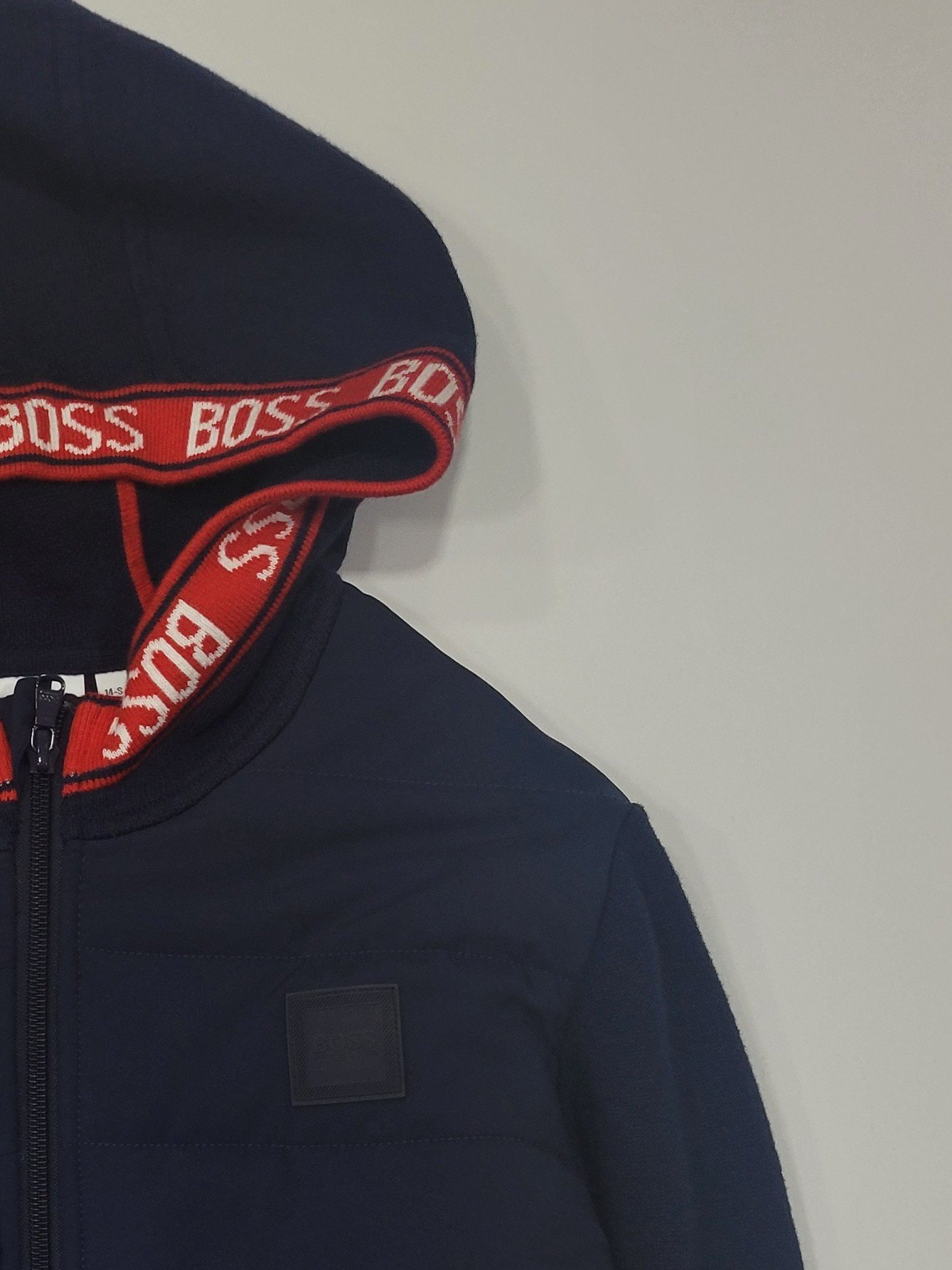 Design: Modelo azul-marinho com detalhes no carapuço em vermelho com o logo “Boss” em branco