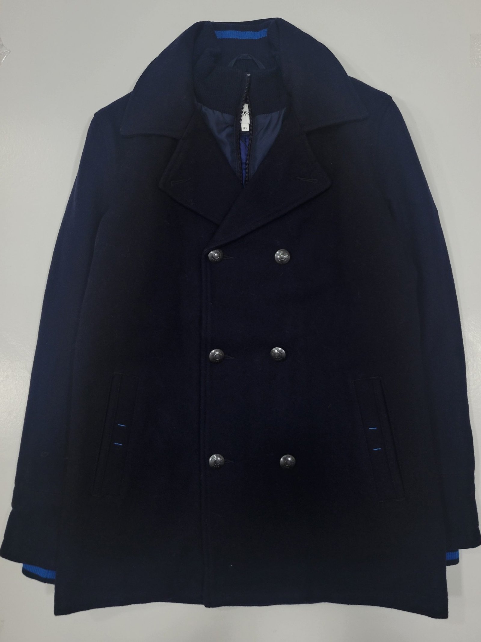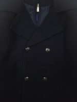 Design: Tecido num modelo assertoado com gola e lapelas largas e diversos botões na frente. Corte solto com bolsos embutidos para as mãos e dois em um