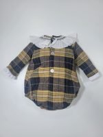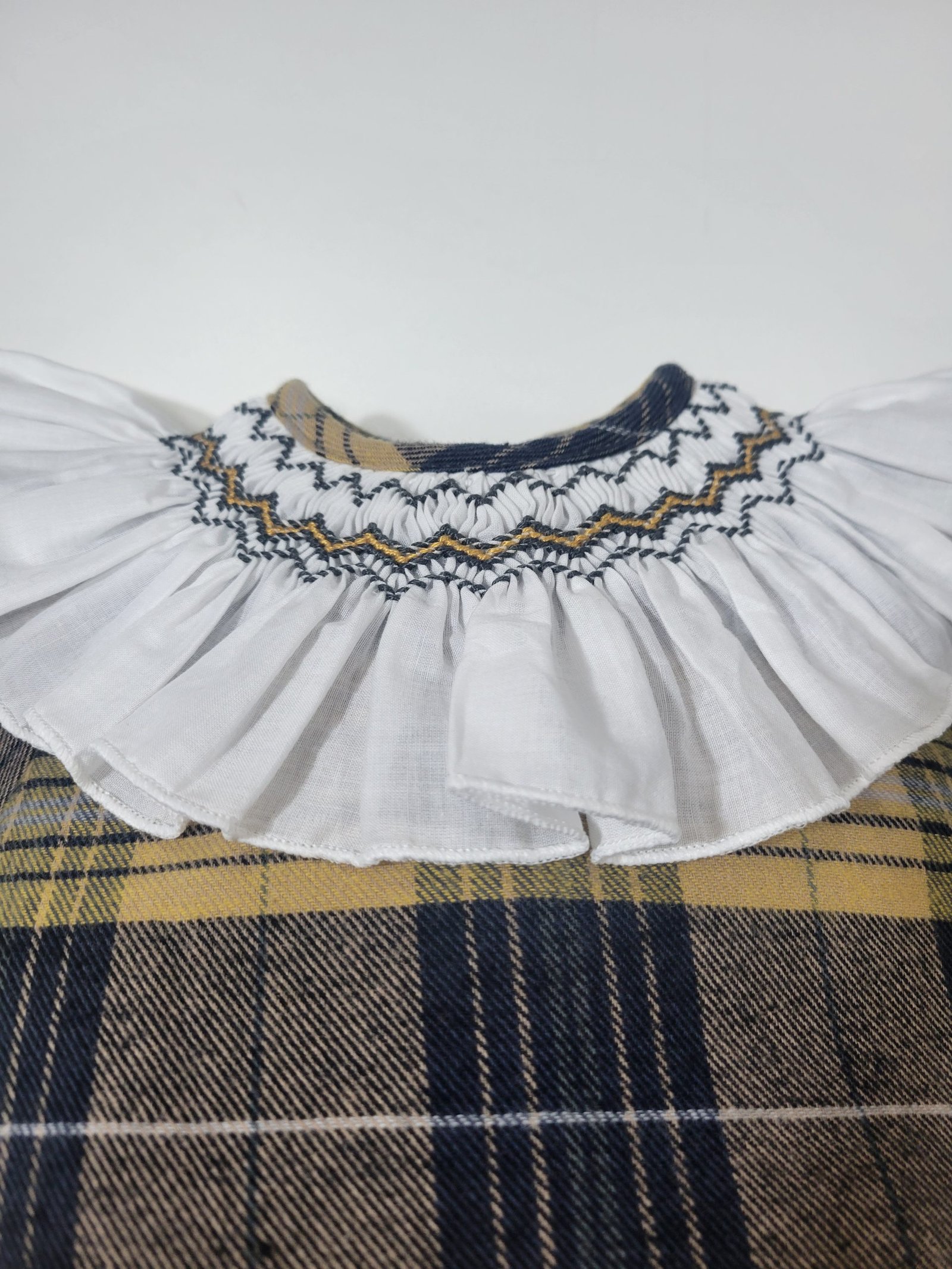 Design: Padrão quadriculado e pormenor de folhos na gola dando um toque criativo e sofisticado