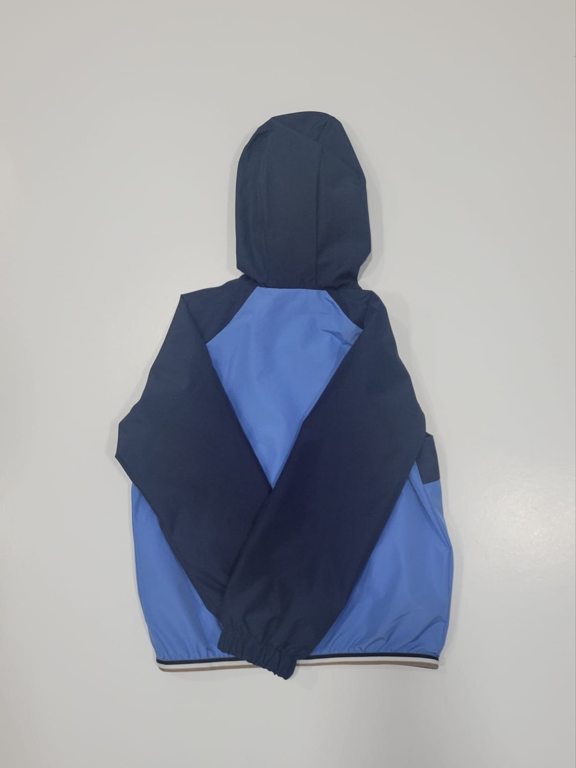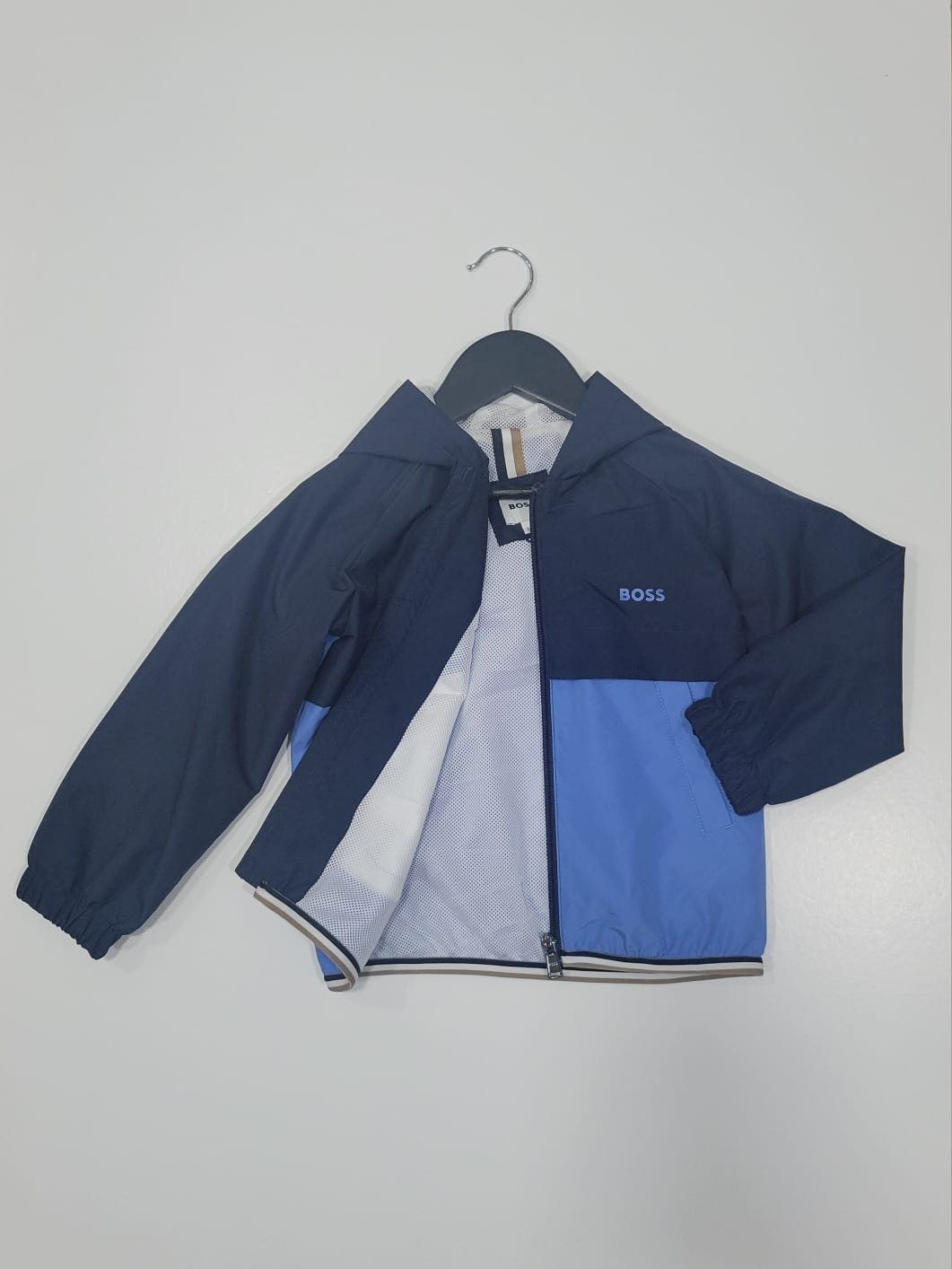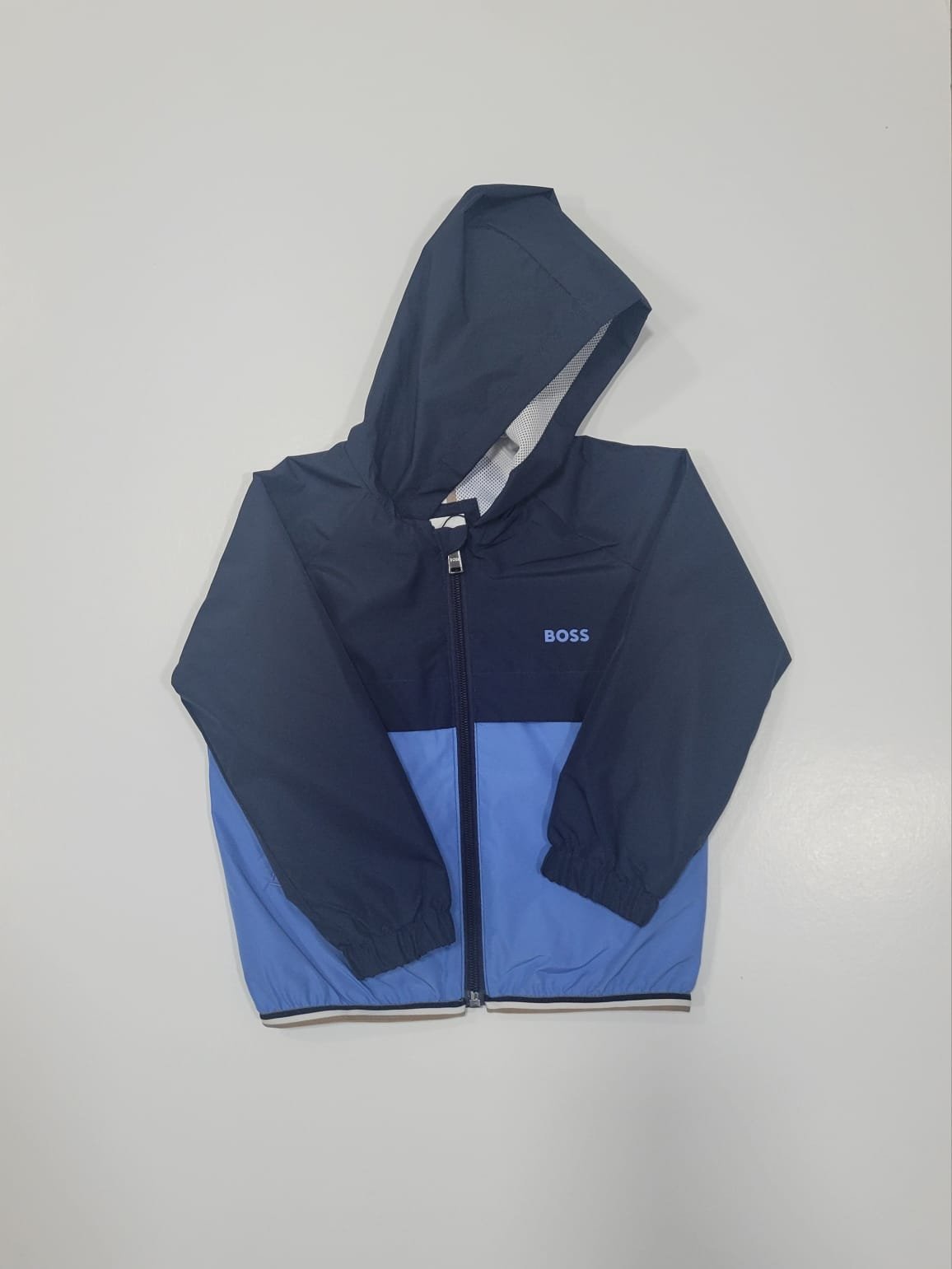 Design: Modelo bicolor com parte superior em azul-escuro e inferior em azul-claro. Apresenta um capuz integrado, fecho frontal e logótipo “BOSS” discreto no peito