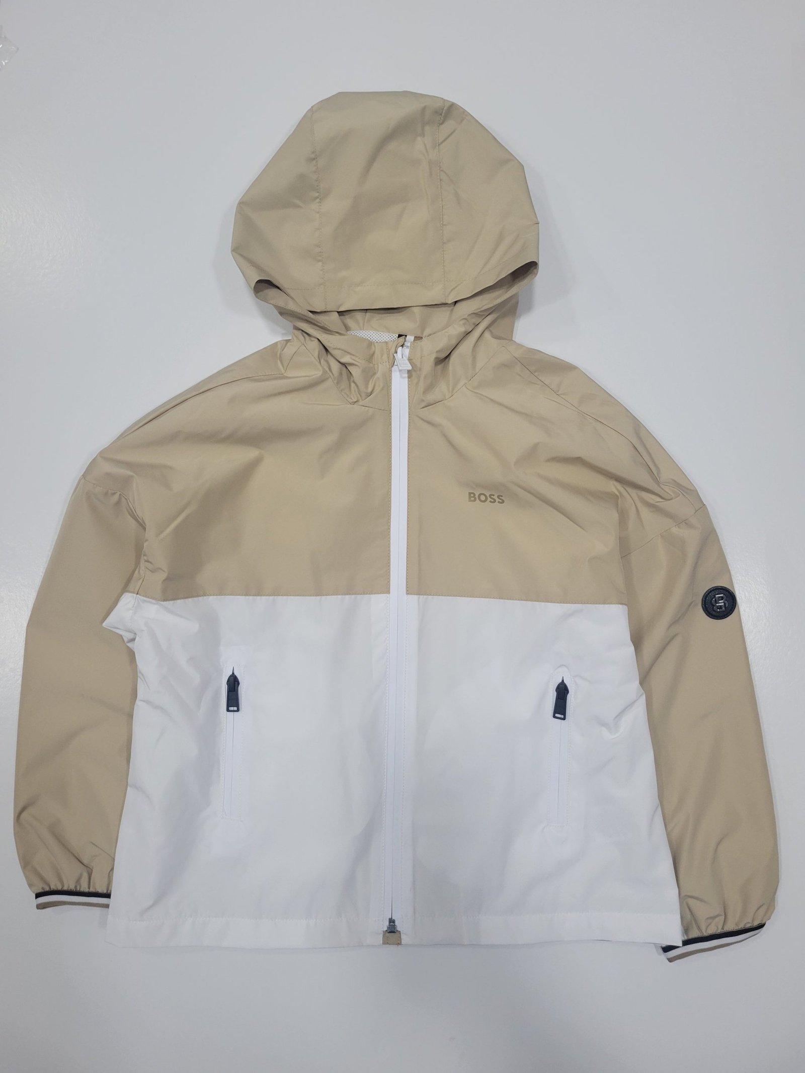 Design: Modelo bicolor com parte superior em bege e a parte inferior em branco e logótipo “BOSS” discreto no peito e de borracha numa das mangas