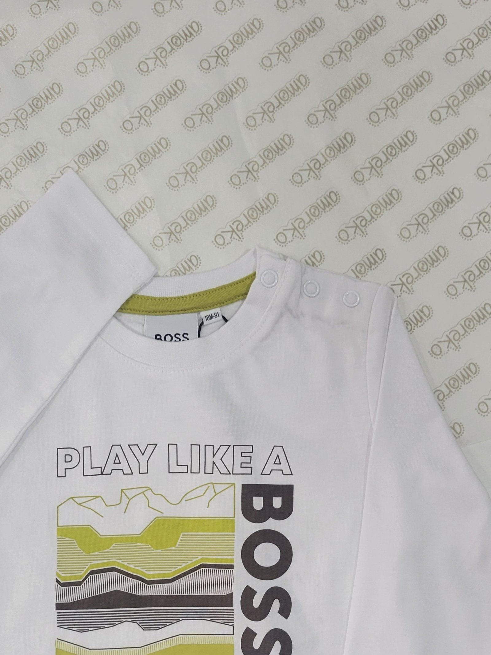 Design: Estampagem “Play Like a Boss” com grafismo abstrato em verde e negro