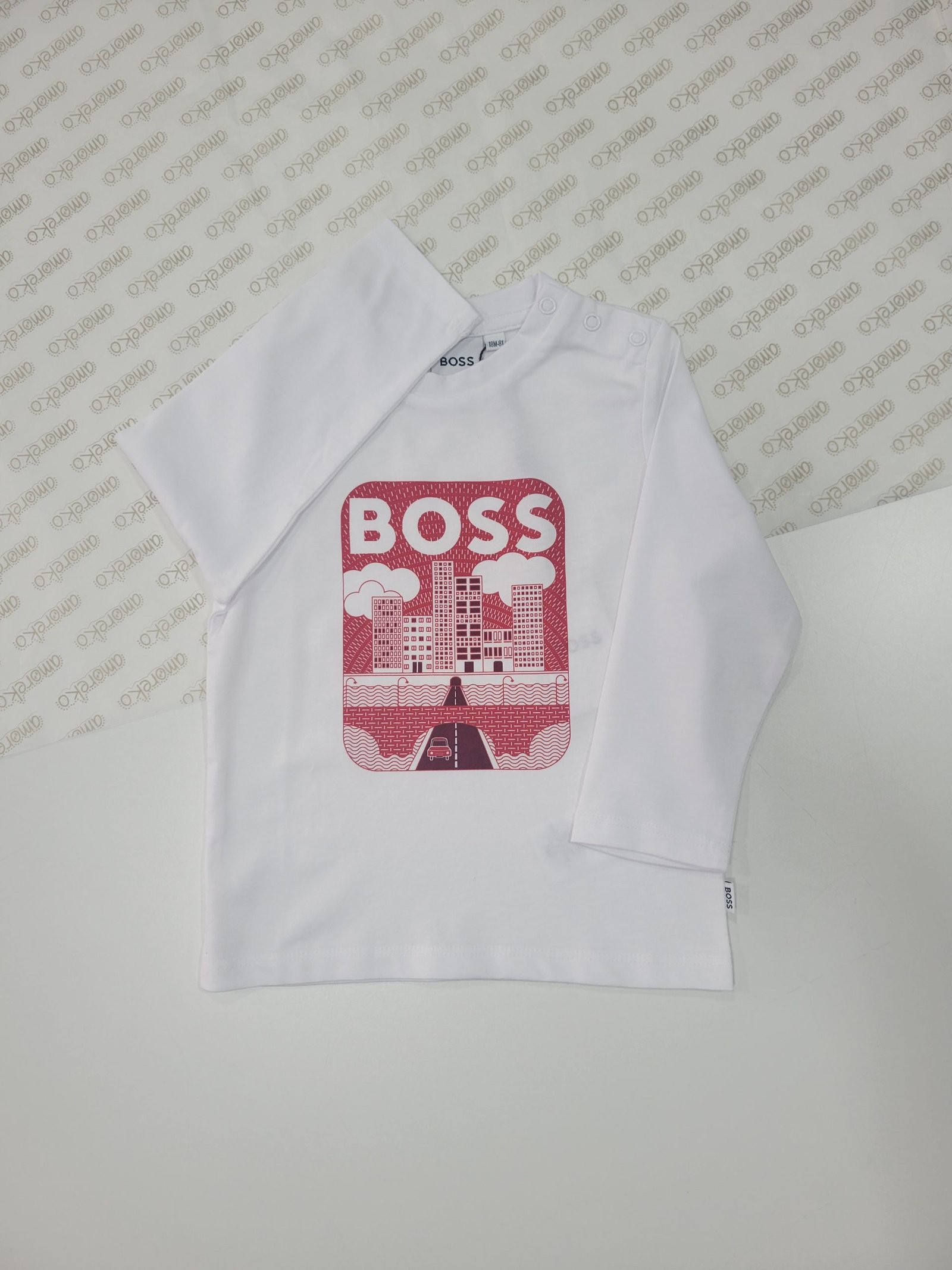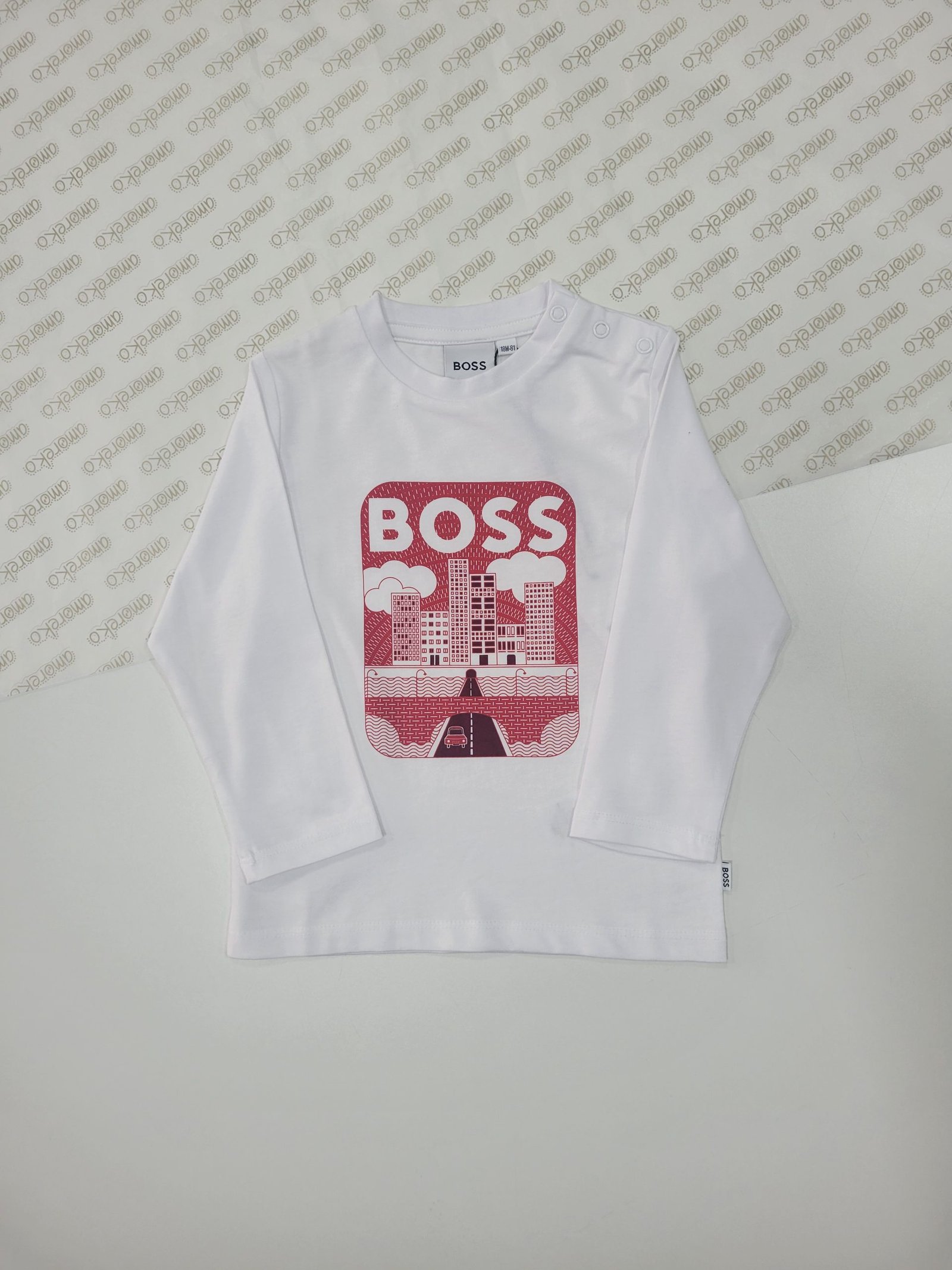 Design: Camisola branca com estampa de um meio urbano ilustrado em vermelho, transmitindo um estilo reconhecível e moderno