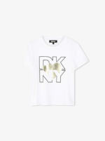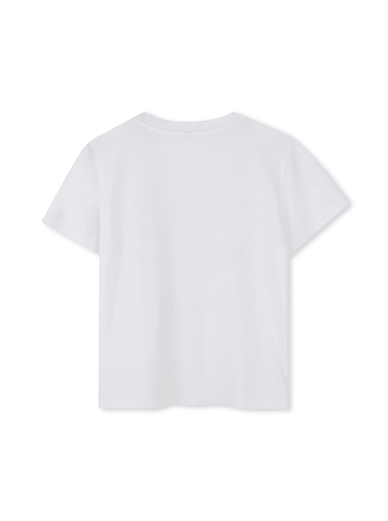Ajuste: Corte regular, gola arredondada, com mangas curtas e logo frontal