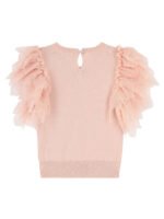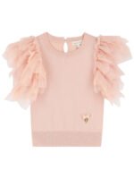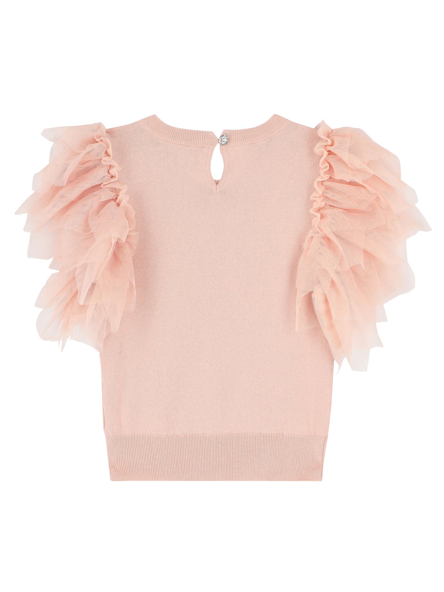Ajuste: Corte regular, mangas curtas, gola arredondada, tule