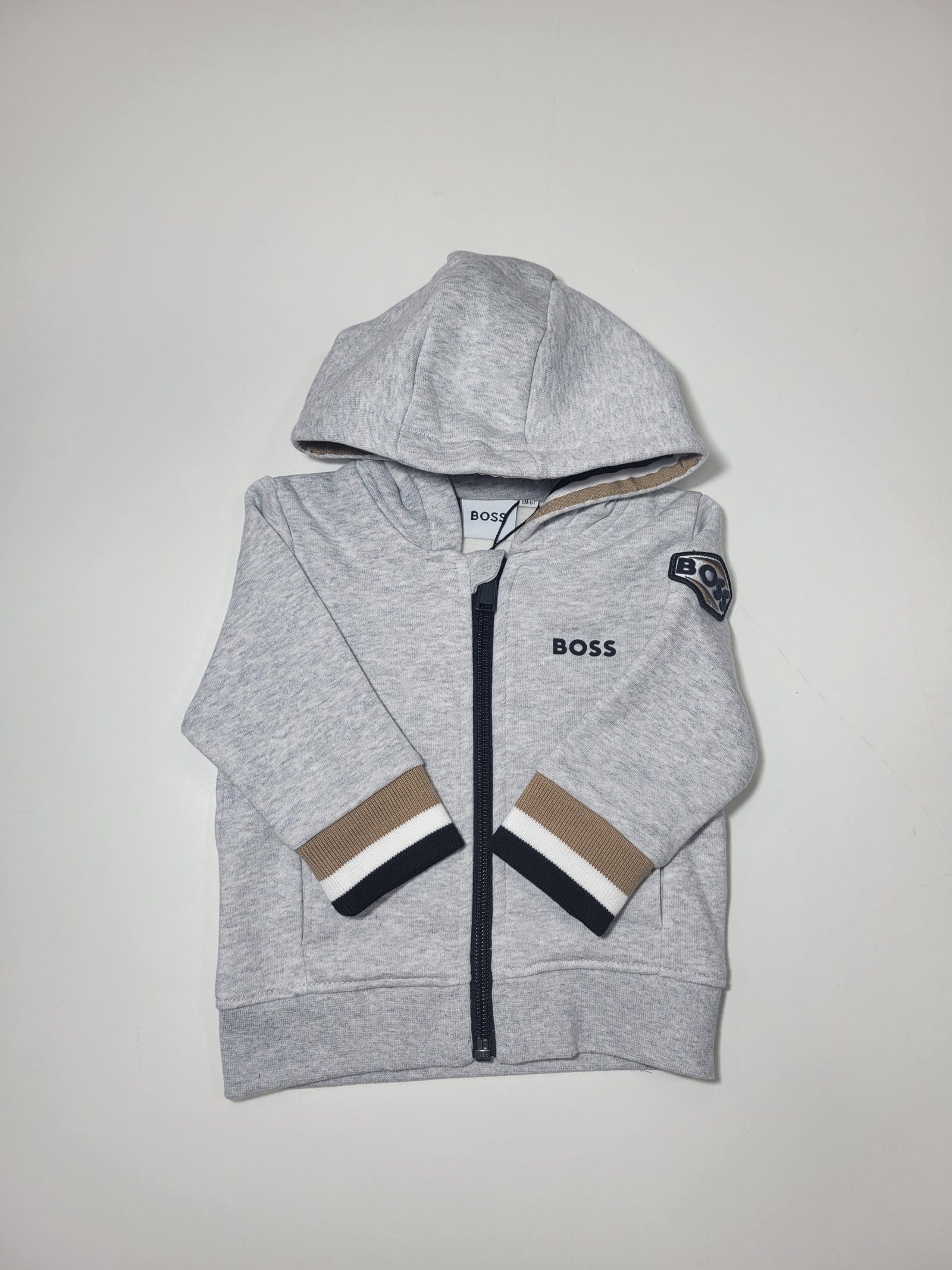 Cores: Cinzento com detalhes tricolor em branco, castanho e preto, ideal para um visual versátil e estiloso.