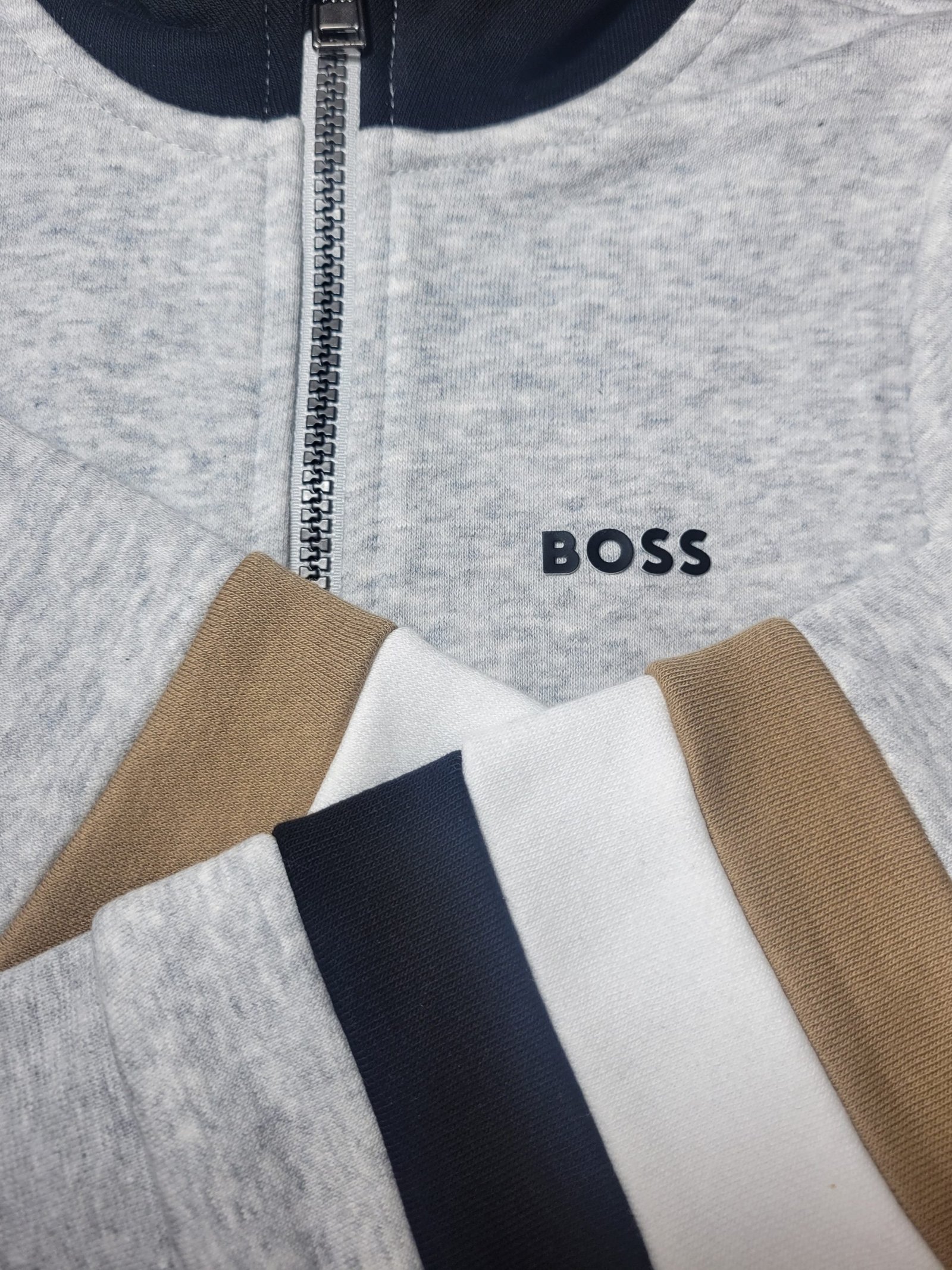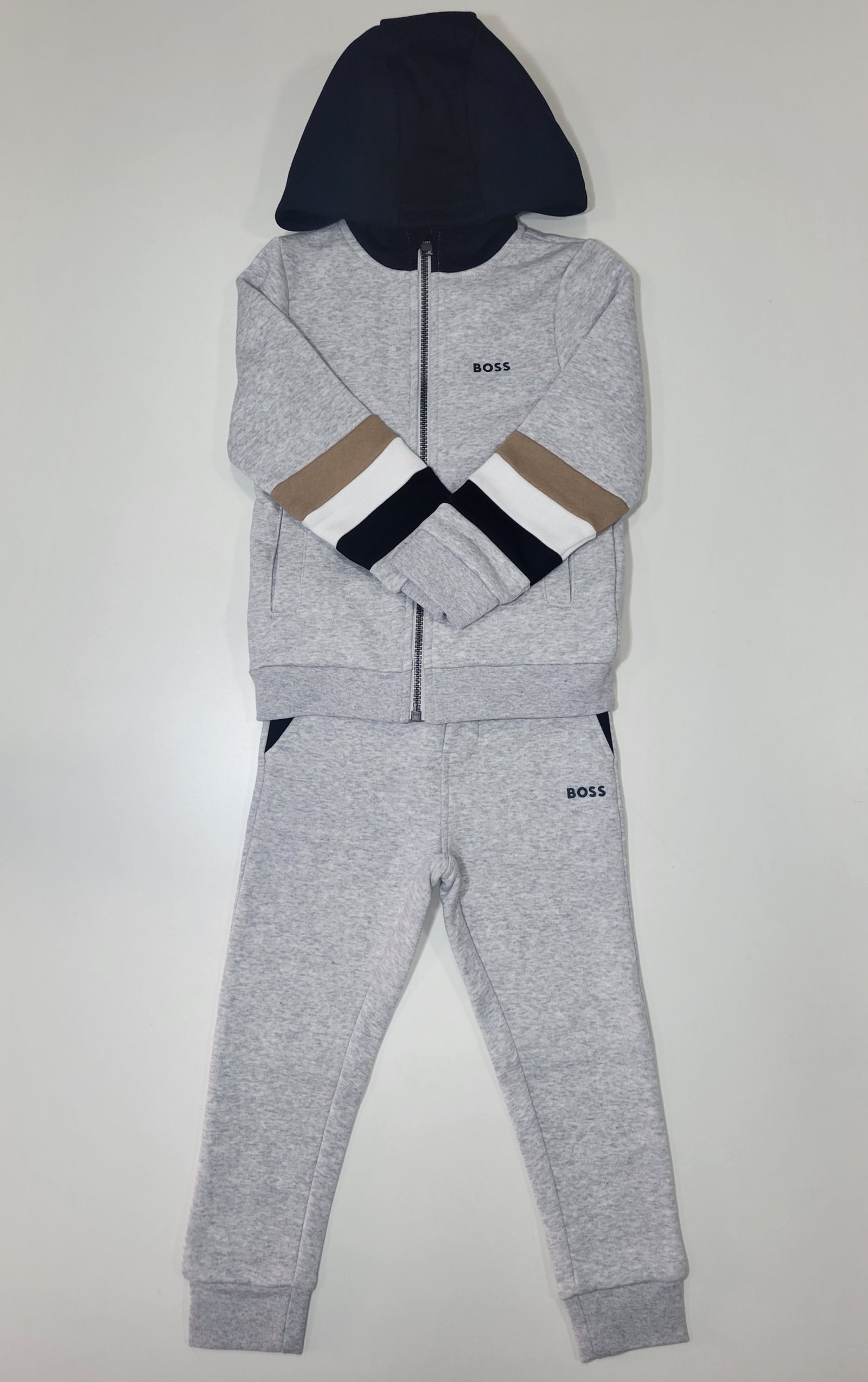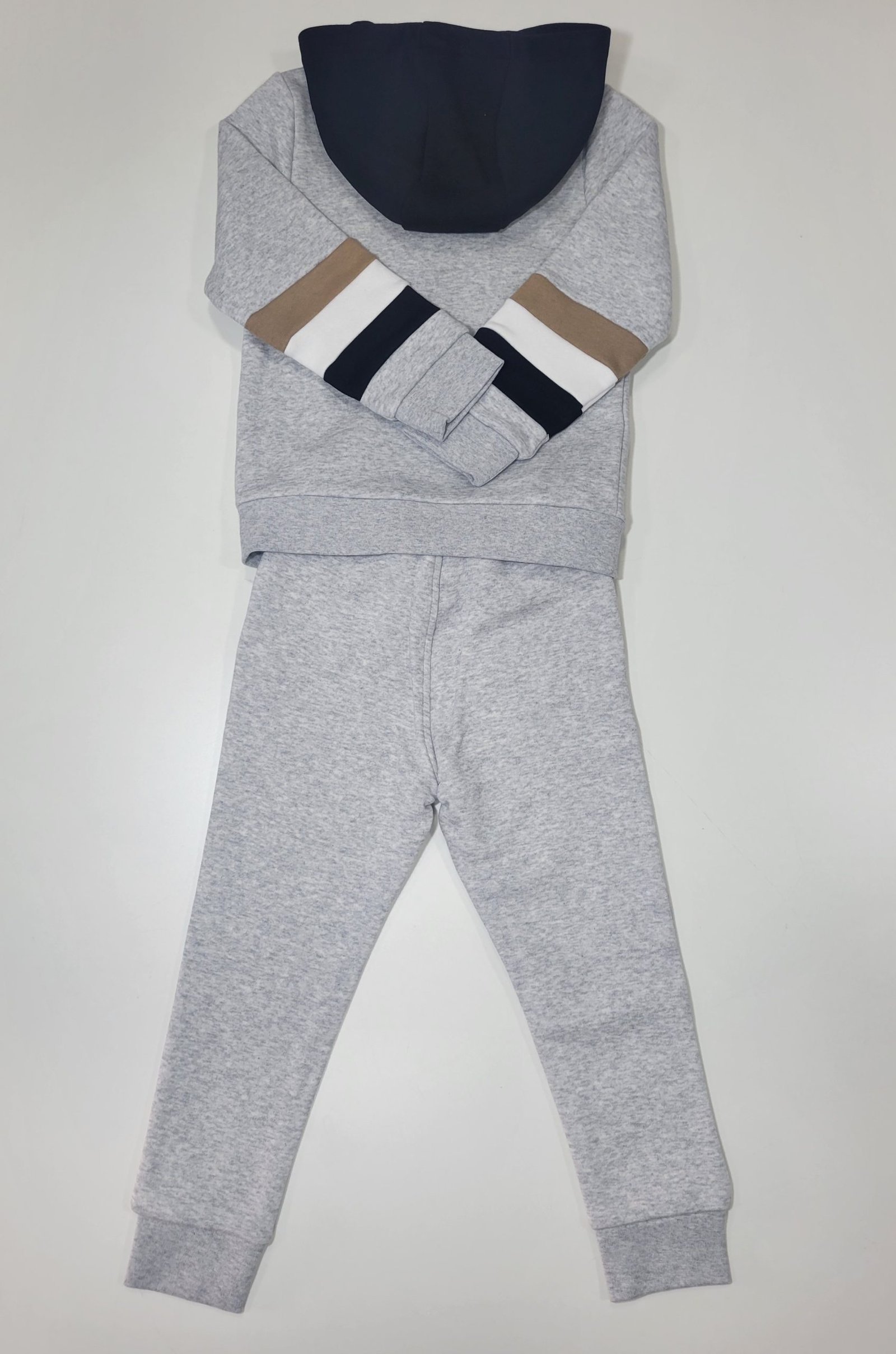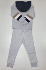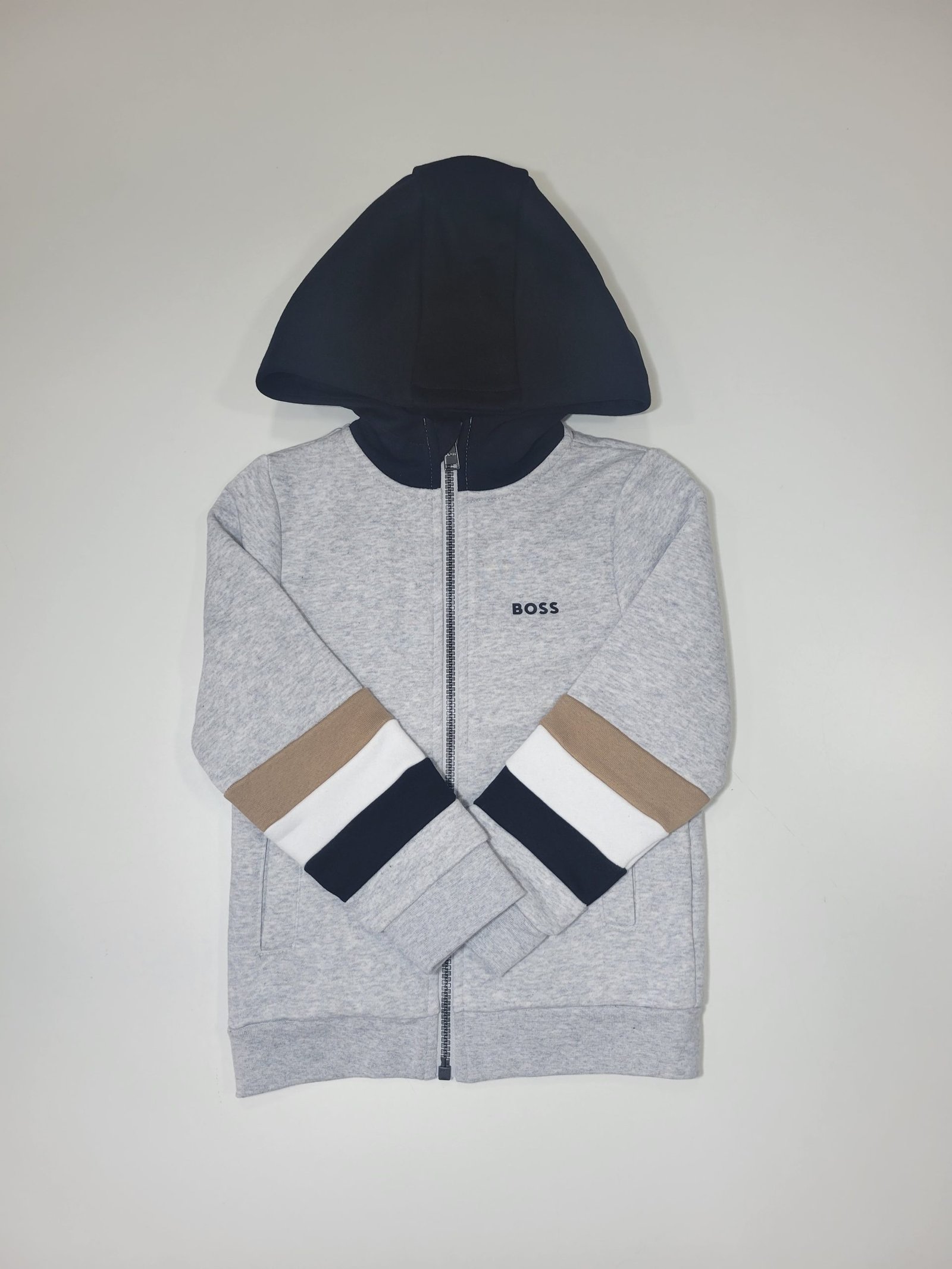 Cores: Cinzento com capuz preto e detalhes tricolor na manga, ideal para um visual versátil e estiloso.