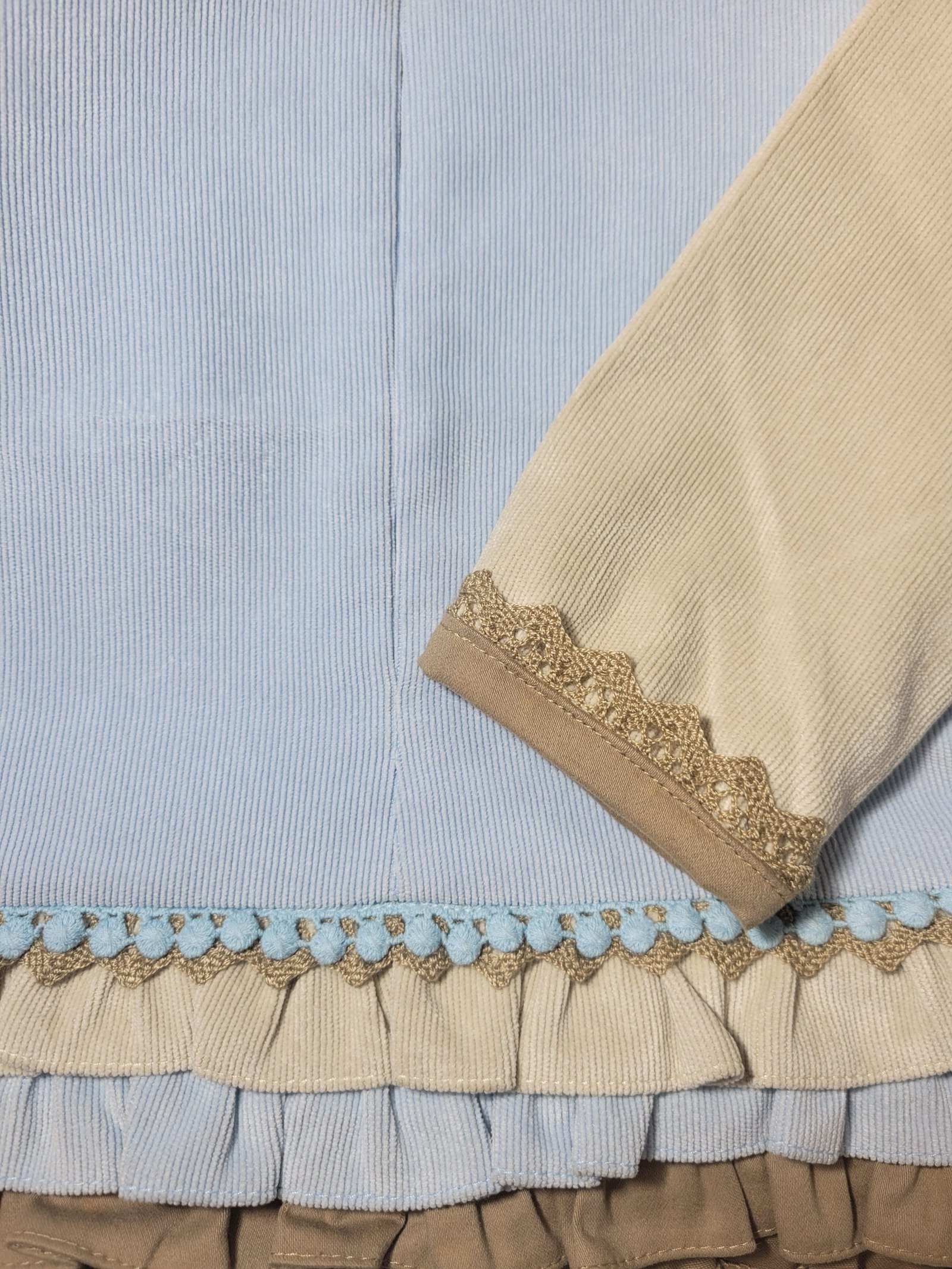 Design: Design criativo com camadas multicolor, pequenos detalhes em renda e um laço na zona do peito