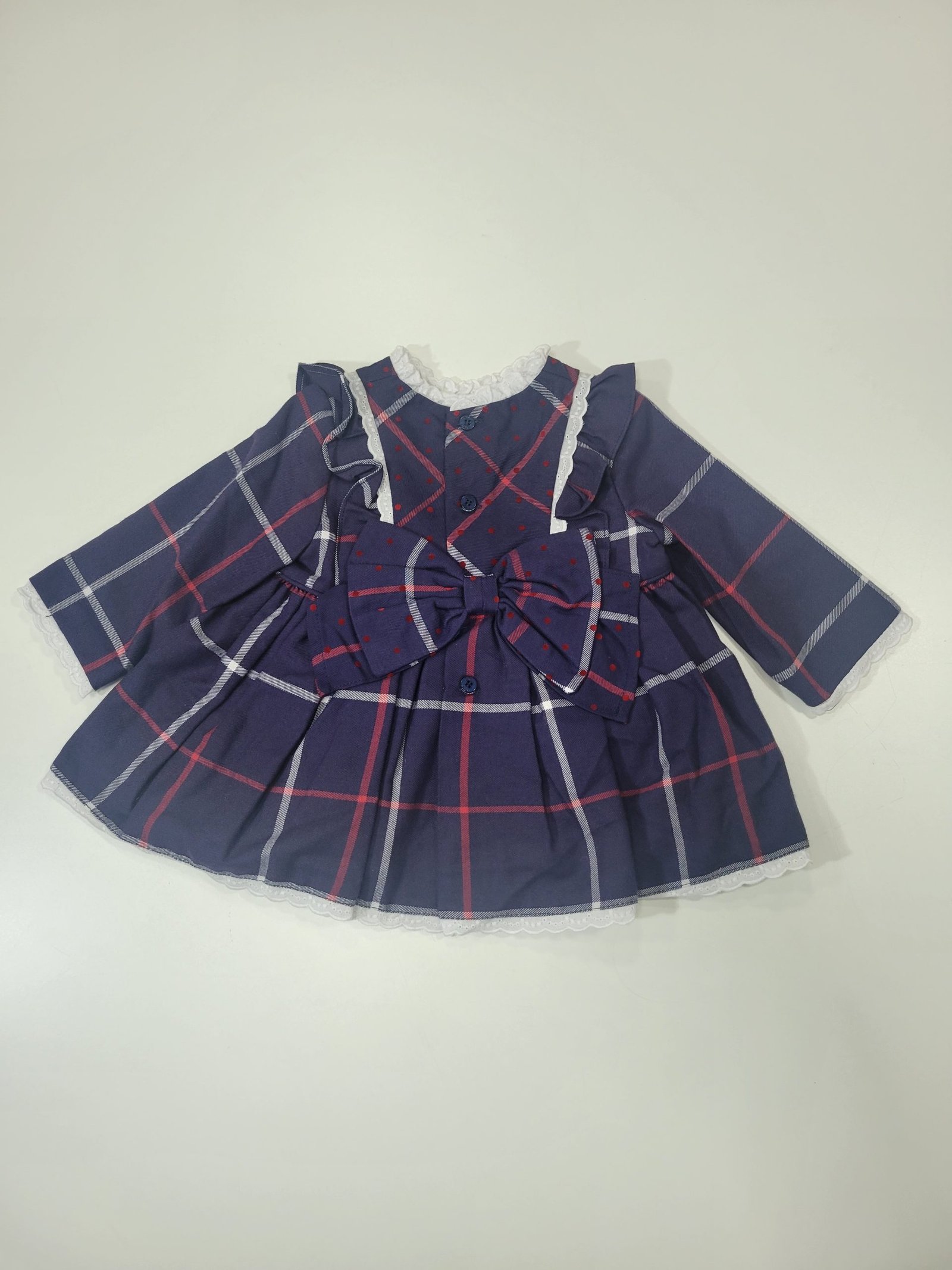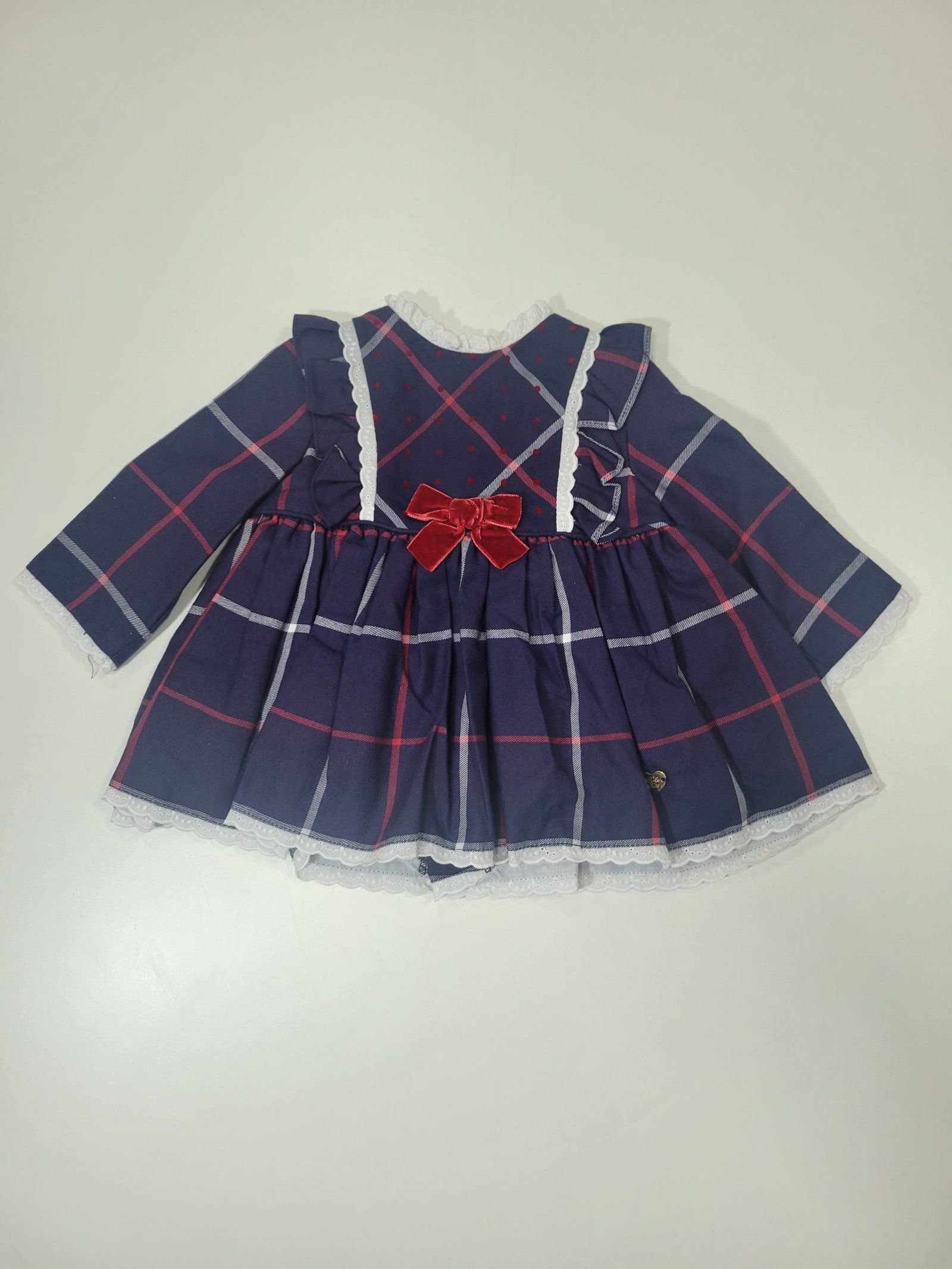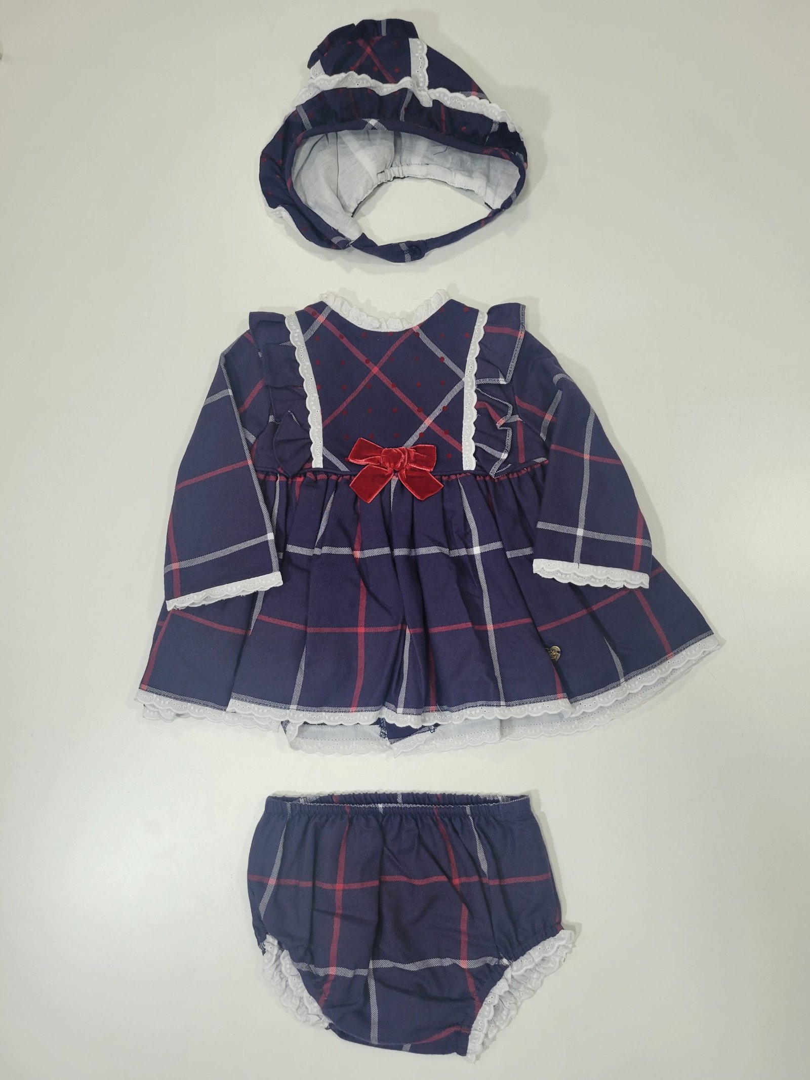 Ajuste: Tapa-Fraldas e chapéu incluído, mangas compridas, gola redonda em renda com laço decorativo central frontal e traseiro, botões traseiros para facilitar o vestir. Tapa-Fraldas com cintura elástica e chapéu com botão para facilidade em vestir