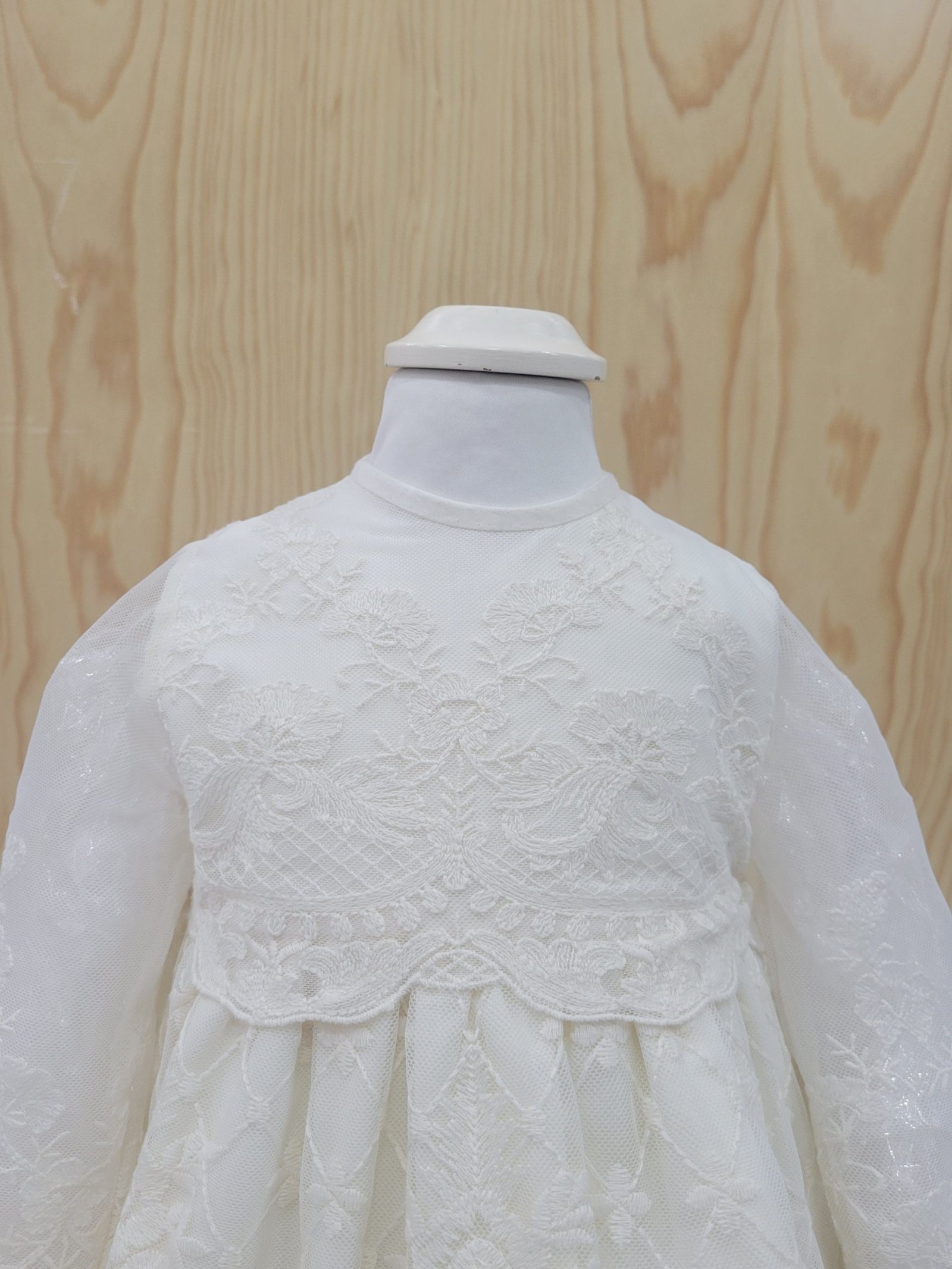 Design: Detalhes com padrões rendados no corpo, mangas, e braguita