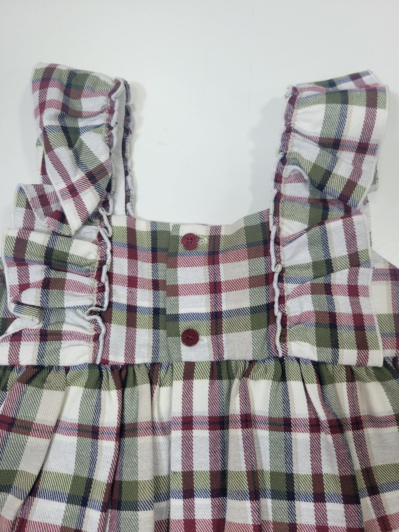 Design: Design cativante com padrão tricolor em xadrez, pequenos detalhes em renda e um laço na zona do peito