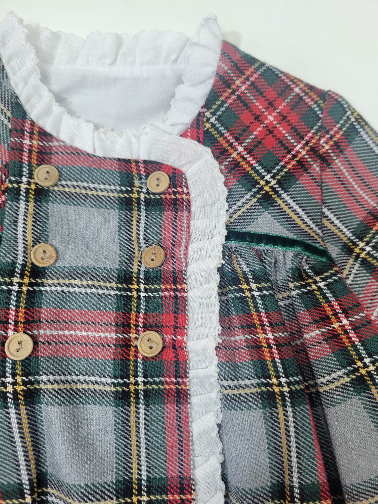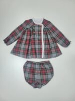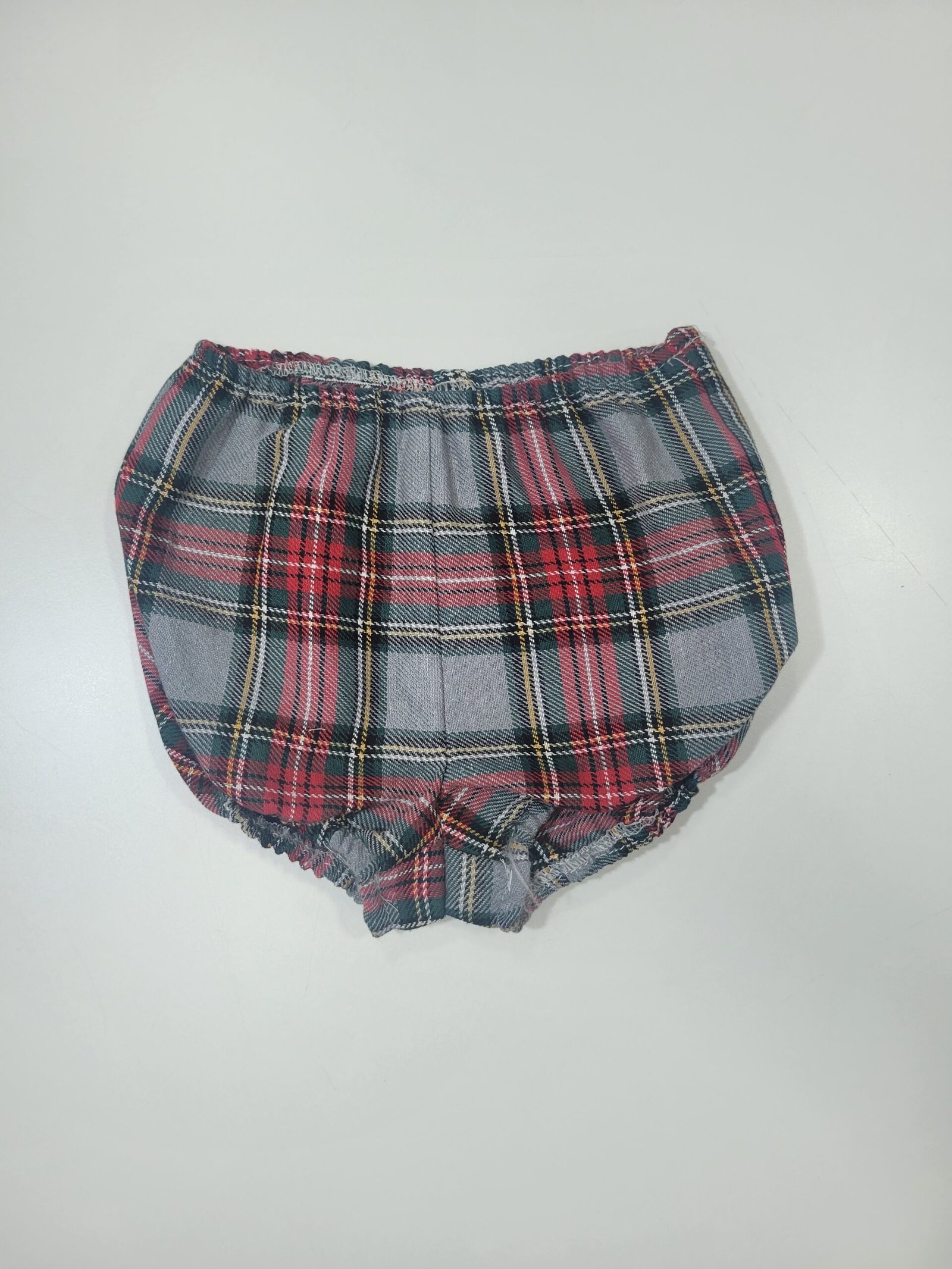Cores: Cinzento com padrão xadrez em verde e vermelho e pormenores em branco