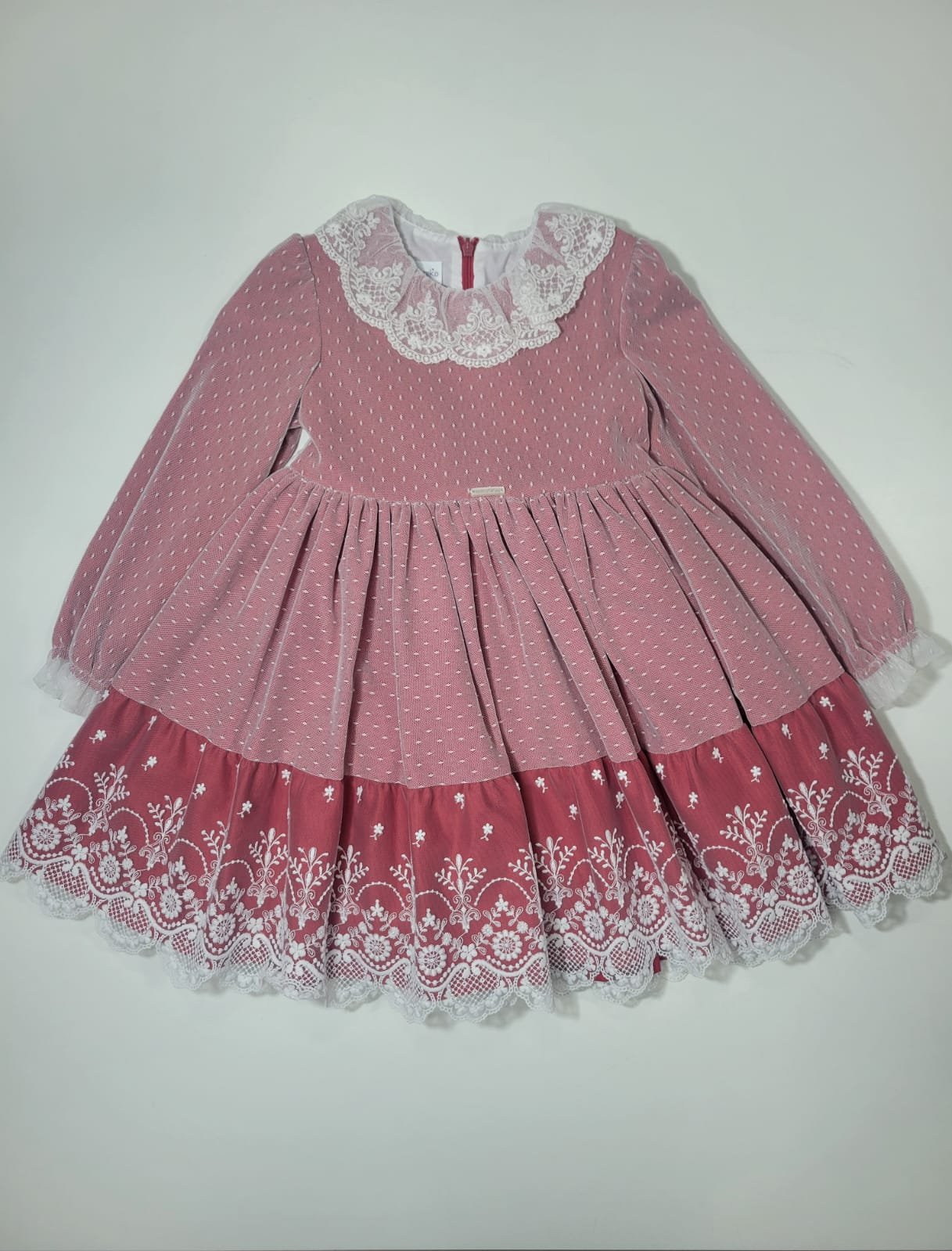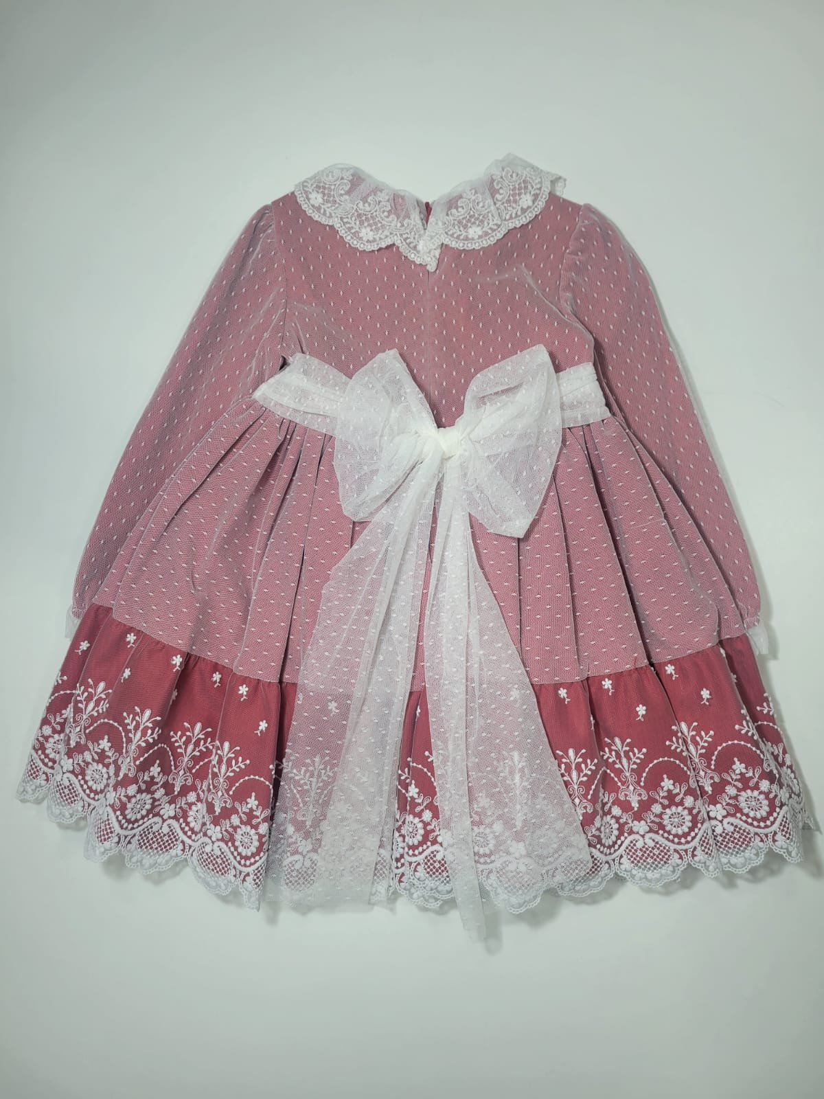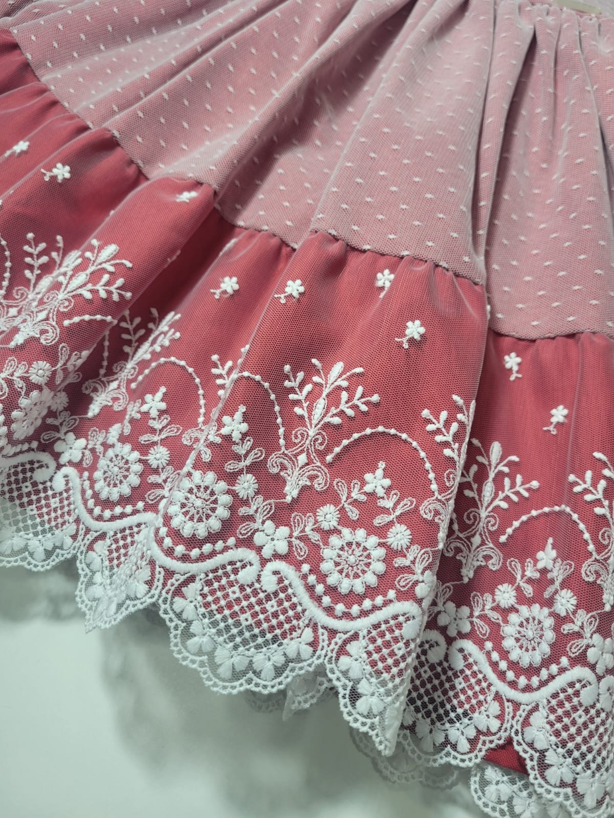 Design: Padrão pontilhado com detalhes florais, gola e borda rendadas e laço traseiro
