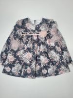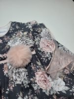 Design: Design criativo com padrão floral e folhos decorativos nas mangas com pompom no peito