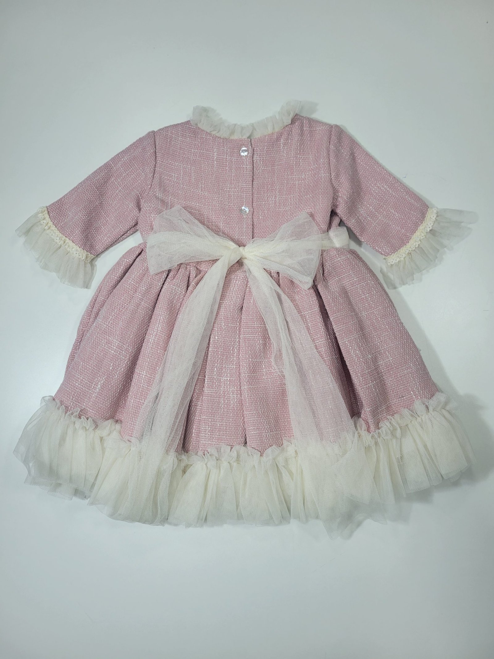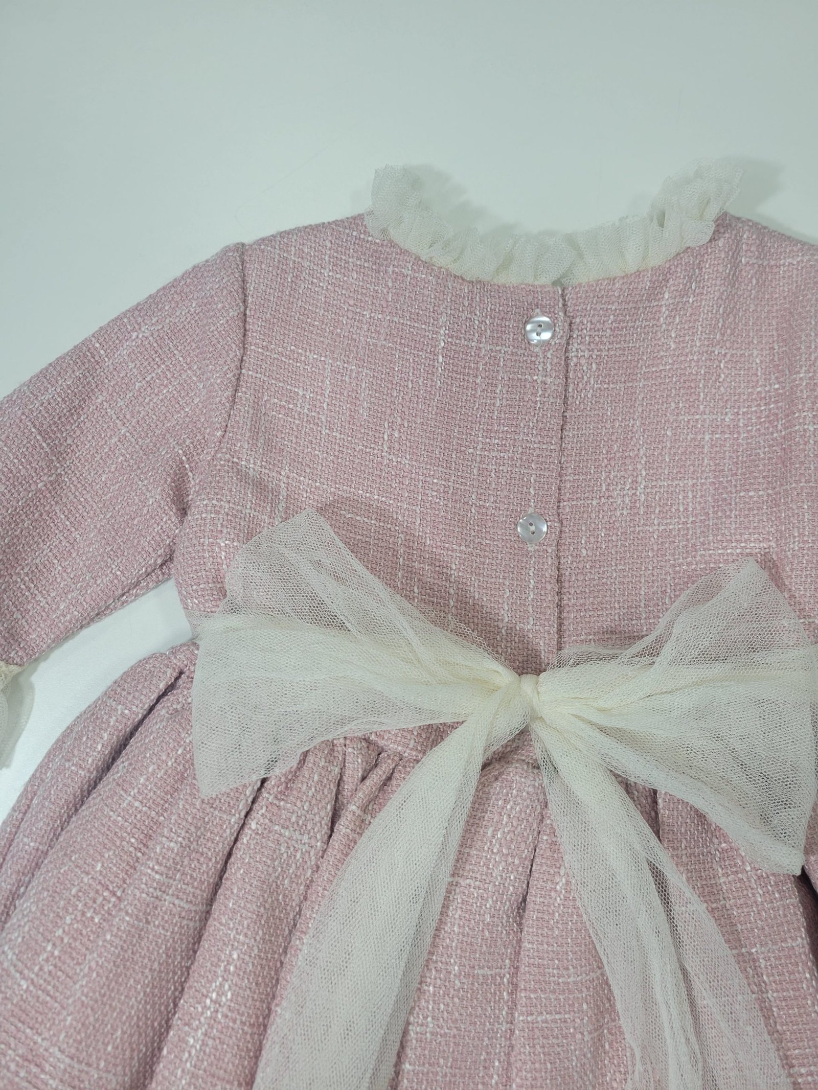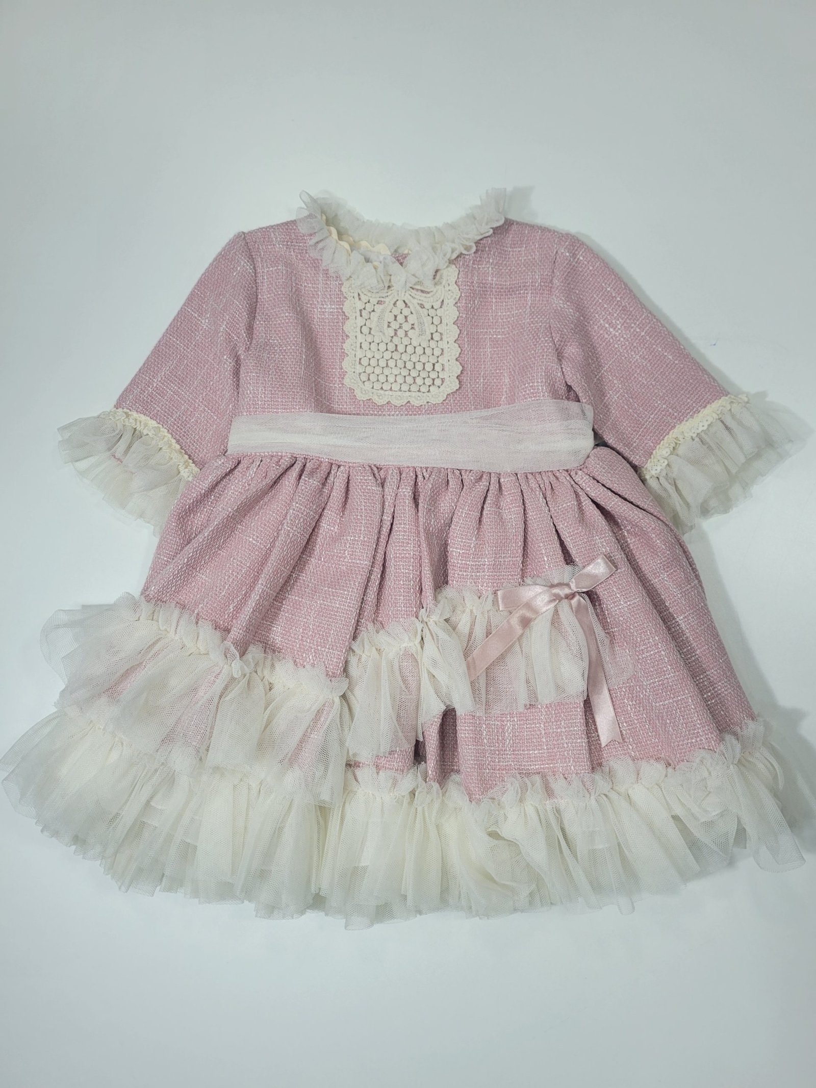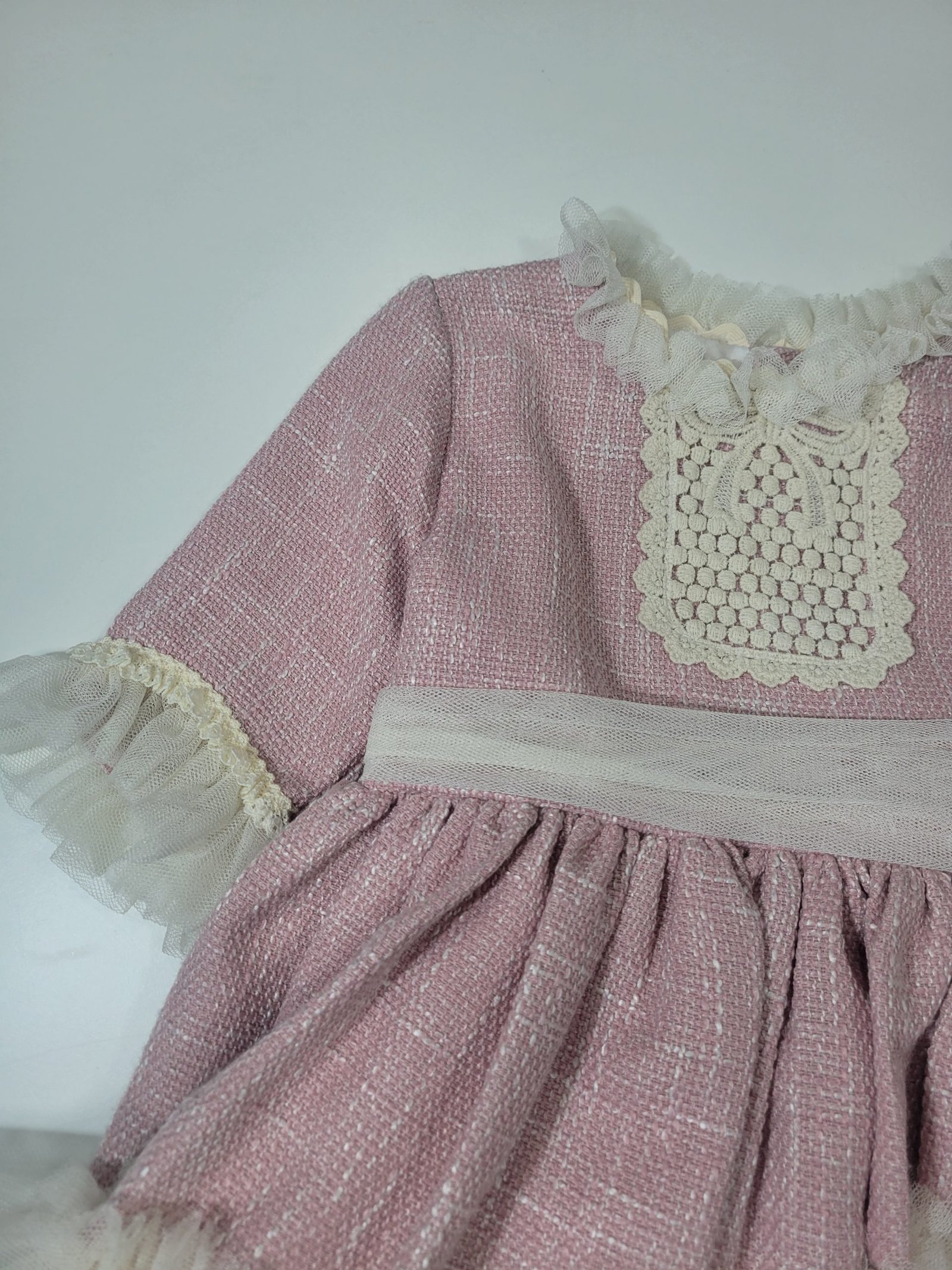 Vestido cor de rosa com folhos e renda