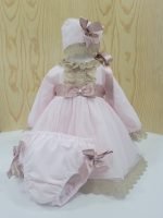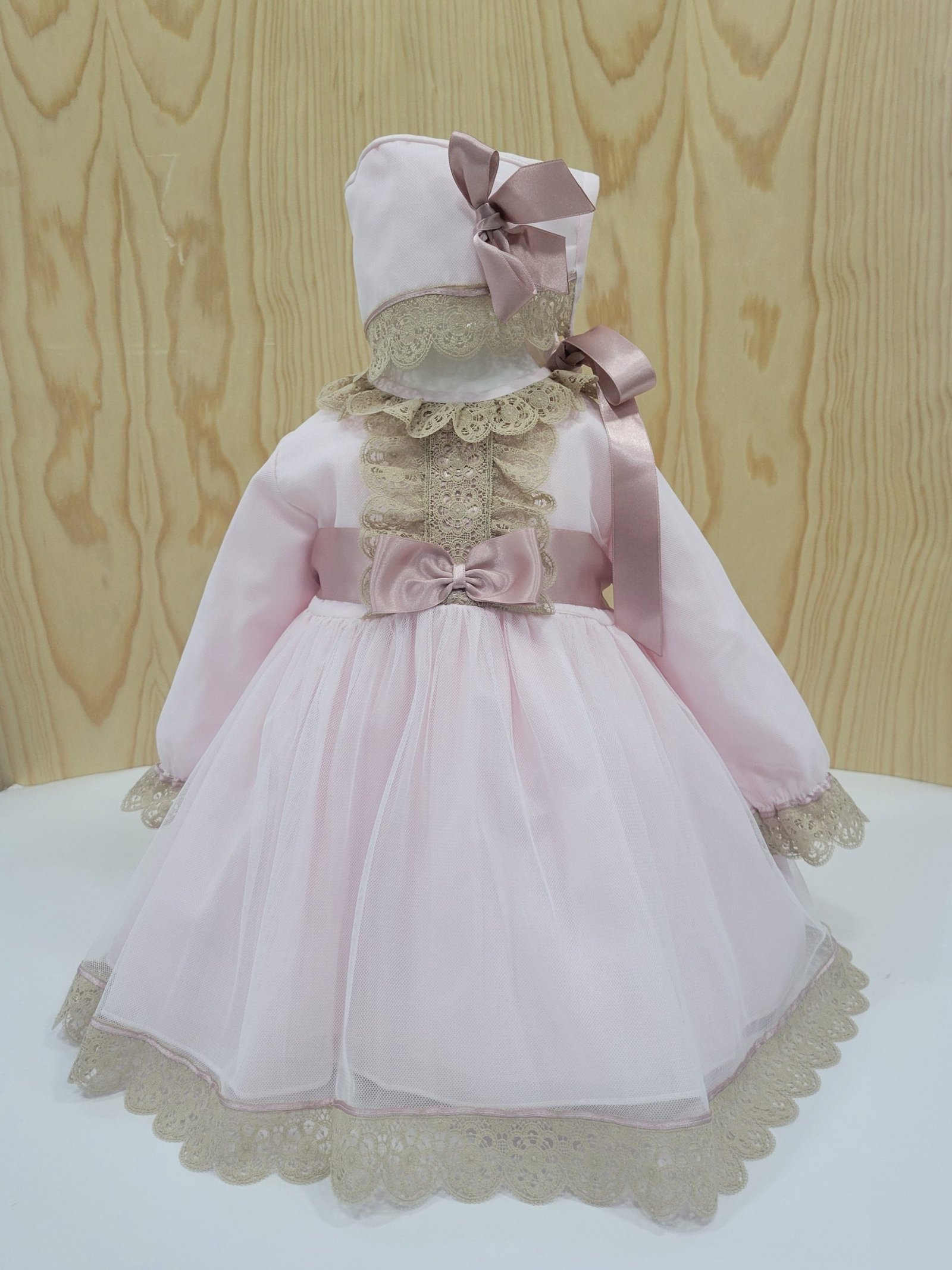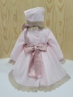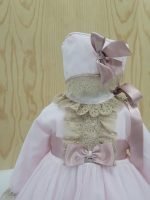 Design: Detalhes com padrões rendados no corpo, mangas, e capota. Laços decorativos na braguita, capota e no corpo do vestido