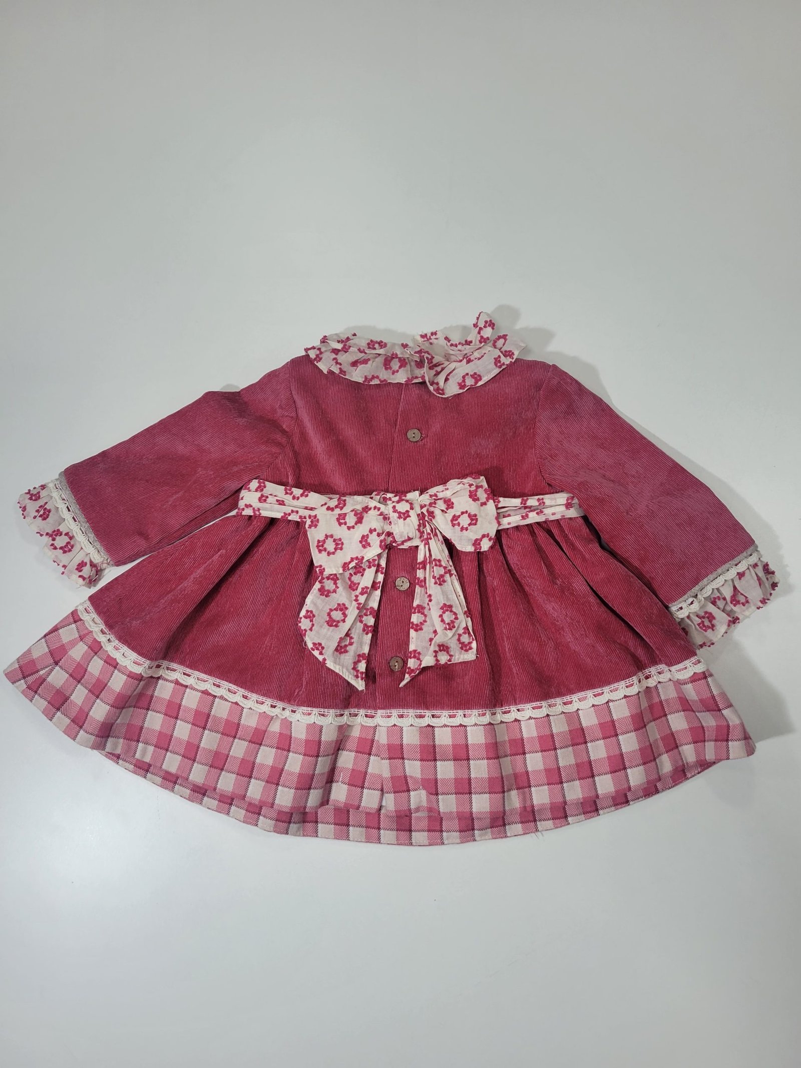 Ajuste: Mangas compridas, gola redonda em folhos, botões na parte traseira para facilitar o vestir e laço decorativo
