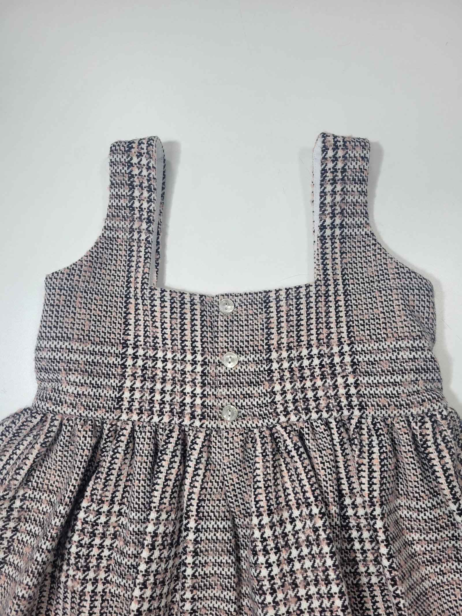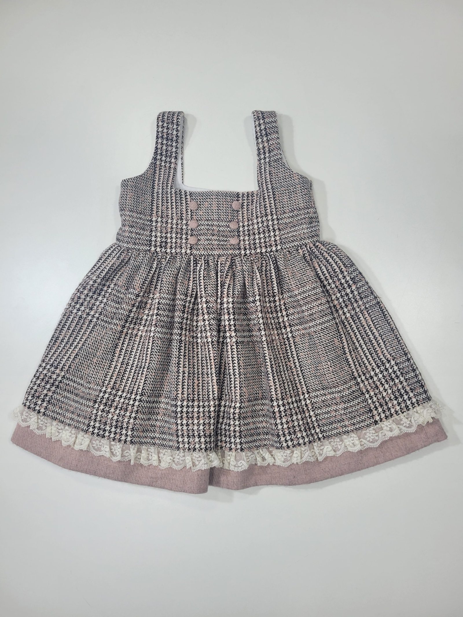 Design: Design criativo com padrão xadrez, bordas rendadas e botões decorativos na parte traseira