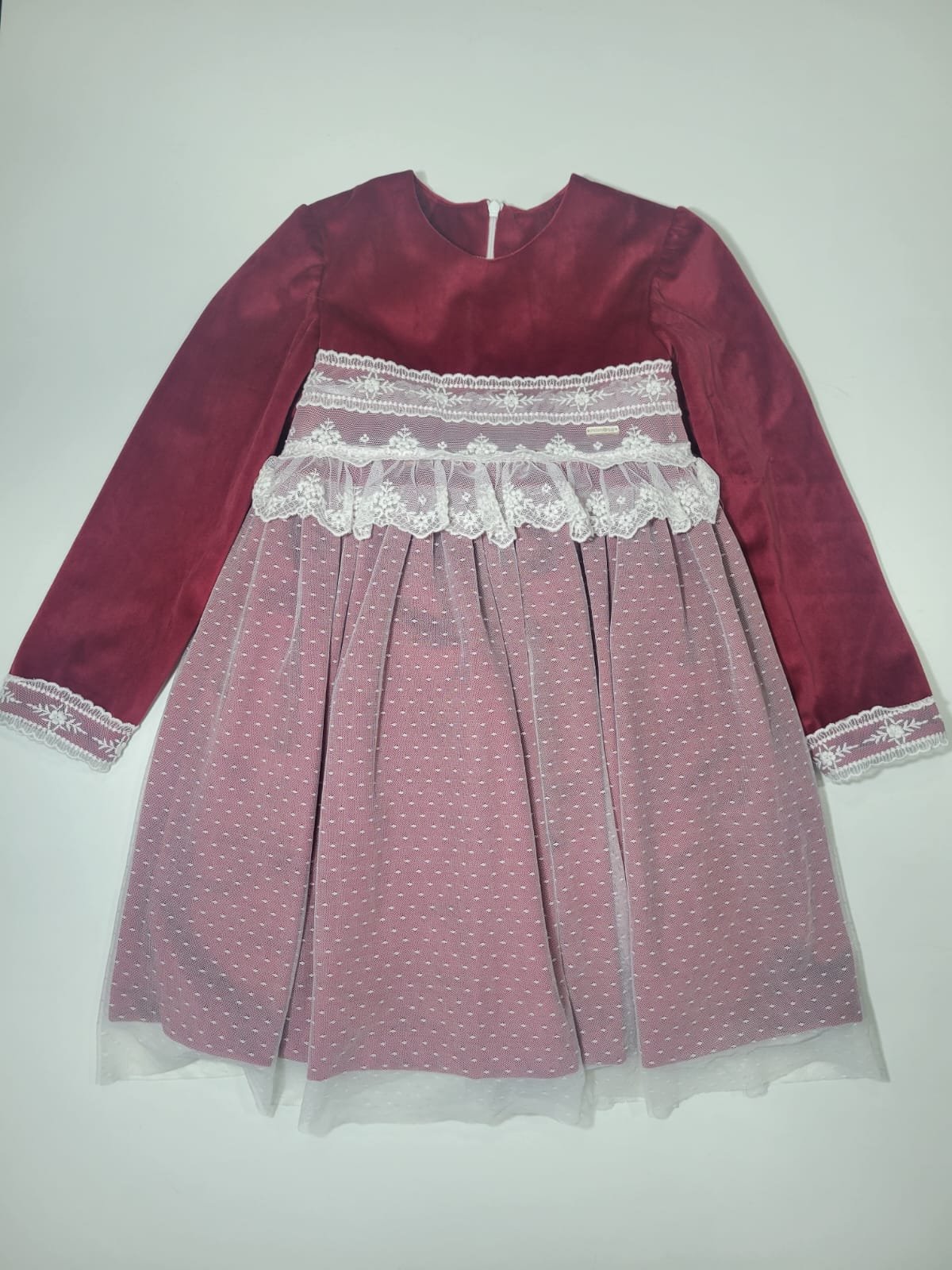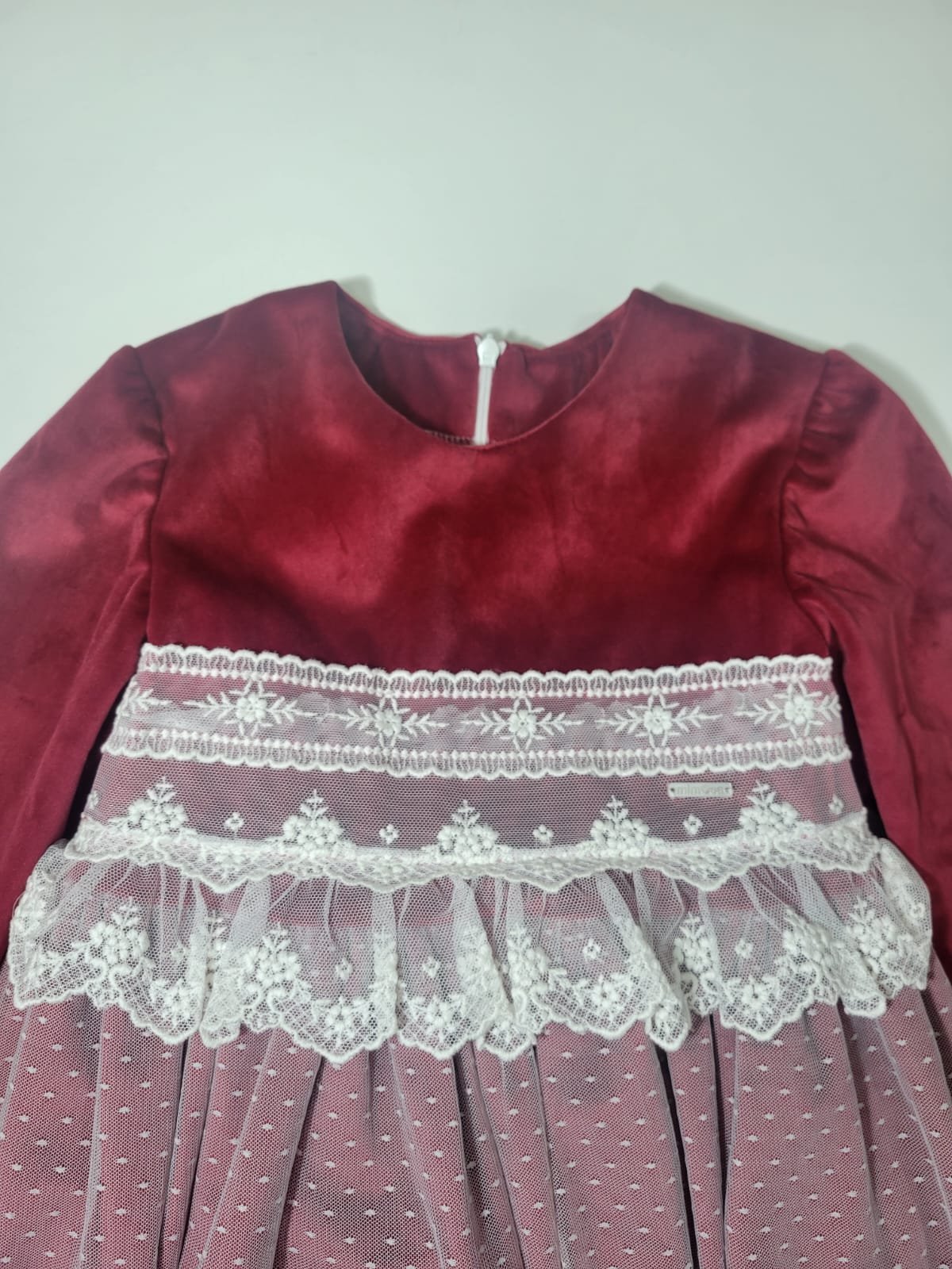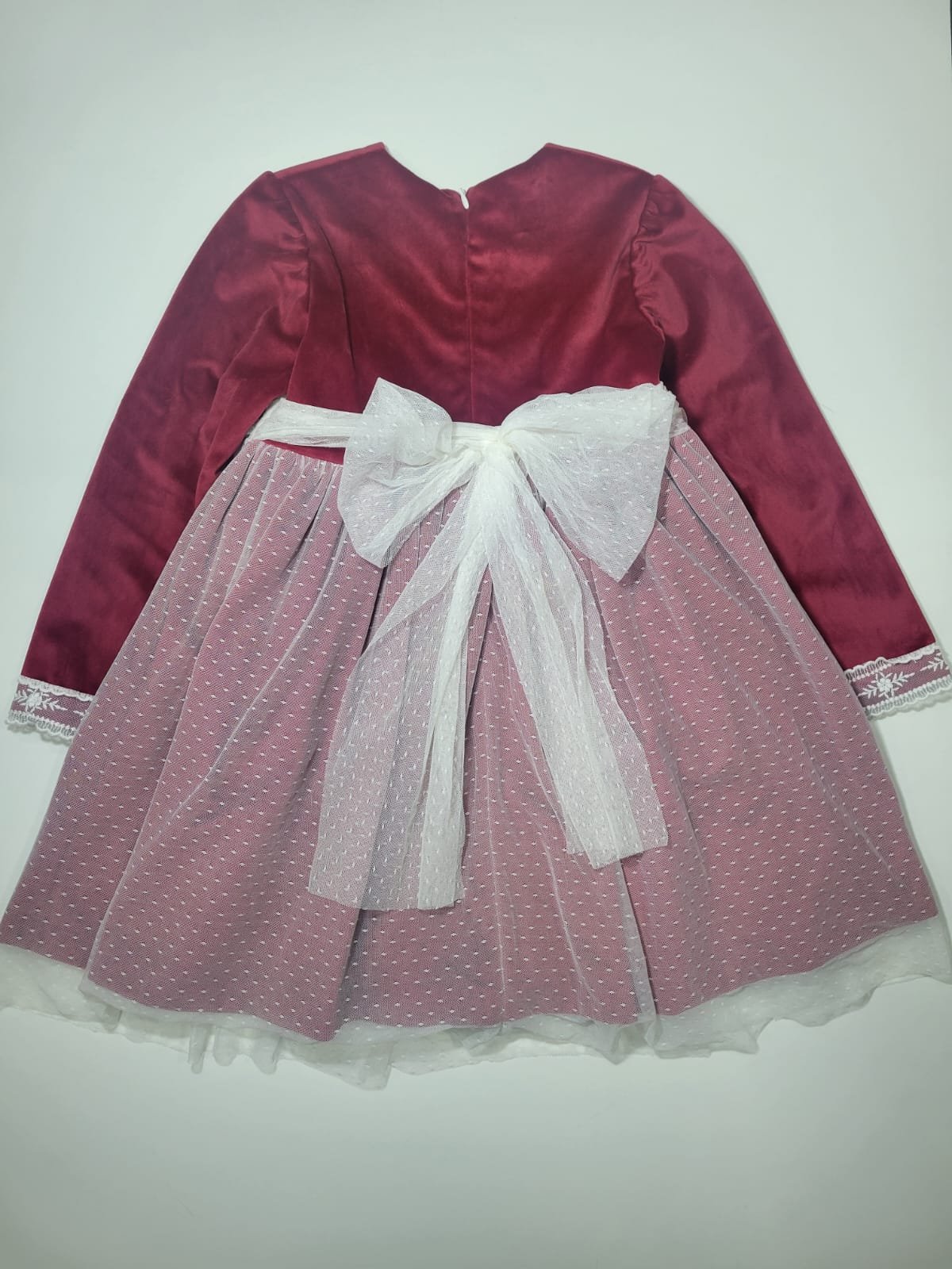 Vestido Vermelho Efeito Veludo com Tule Branco e Laço