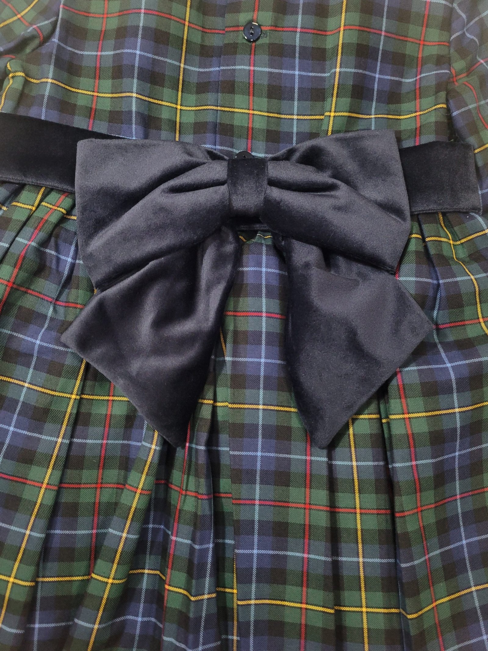 Design: Padrão quadriculado com fita e gola de veludo, dando um toque criativo e sofisticado e laço traseiro