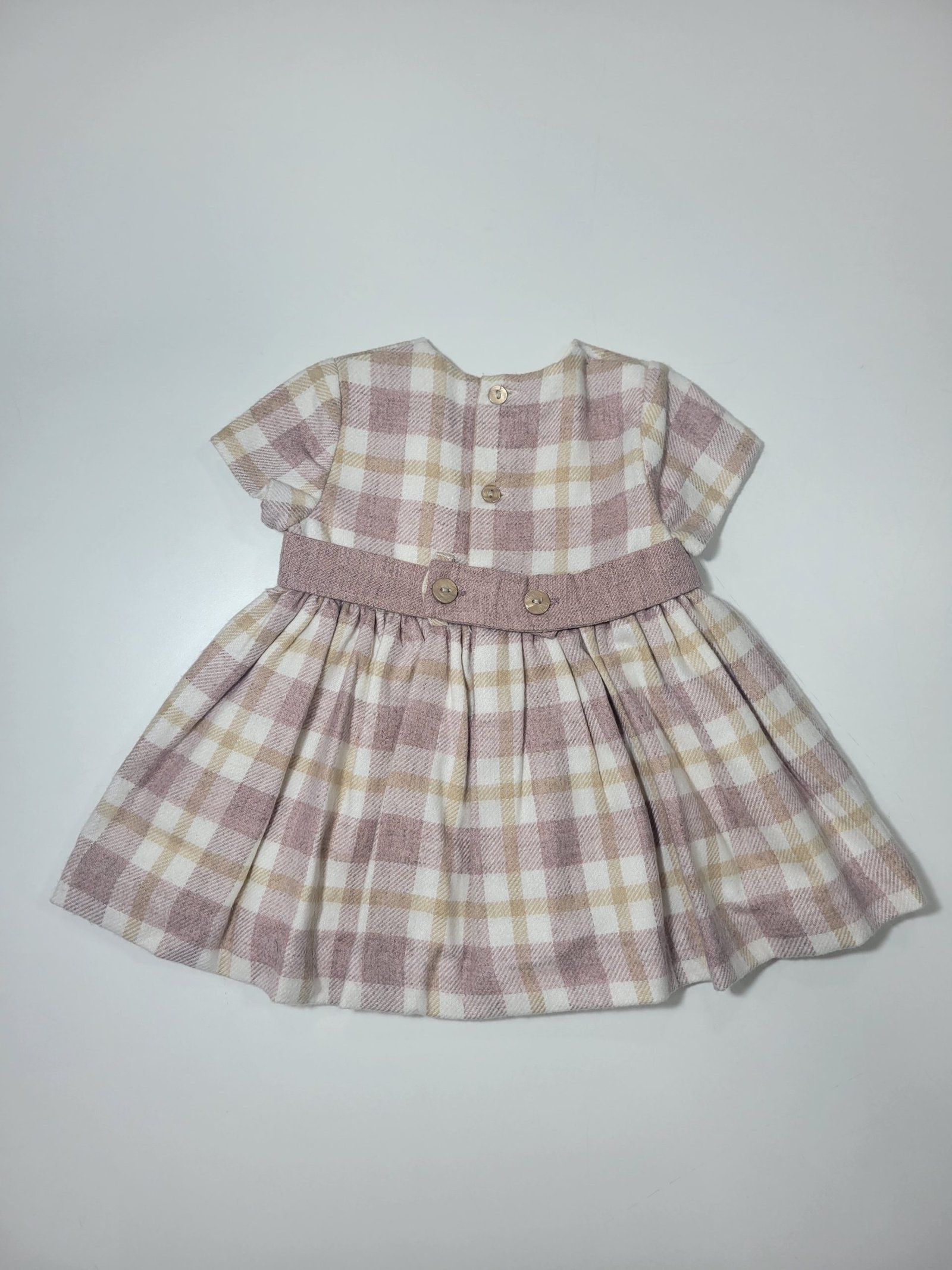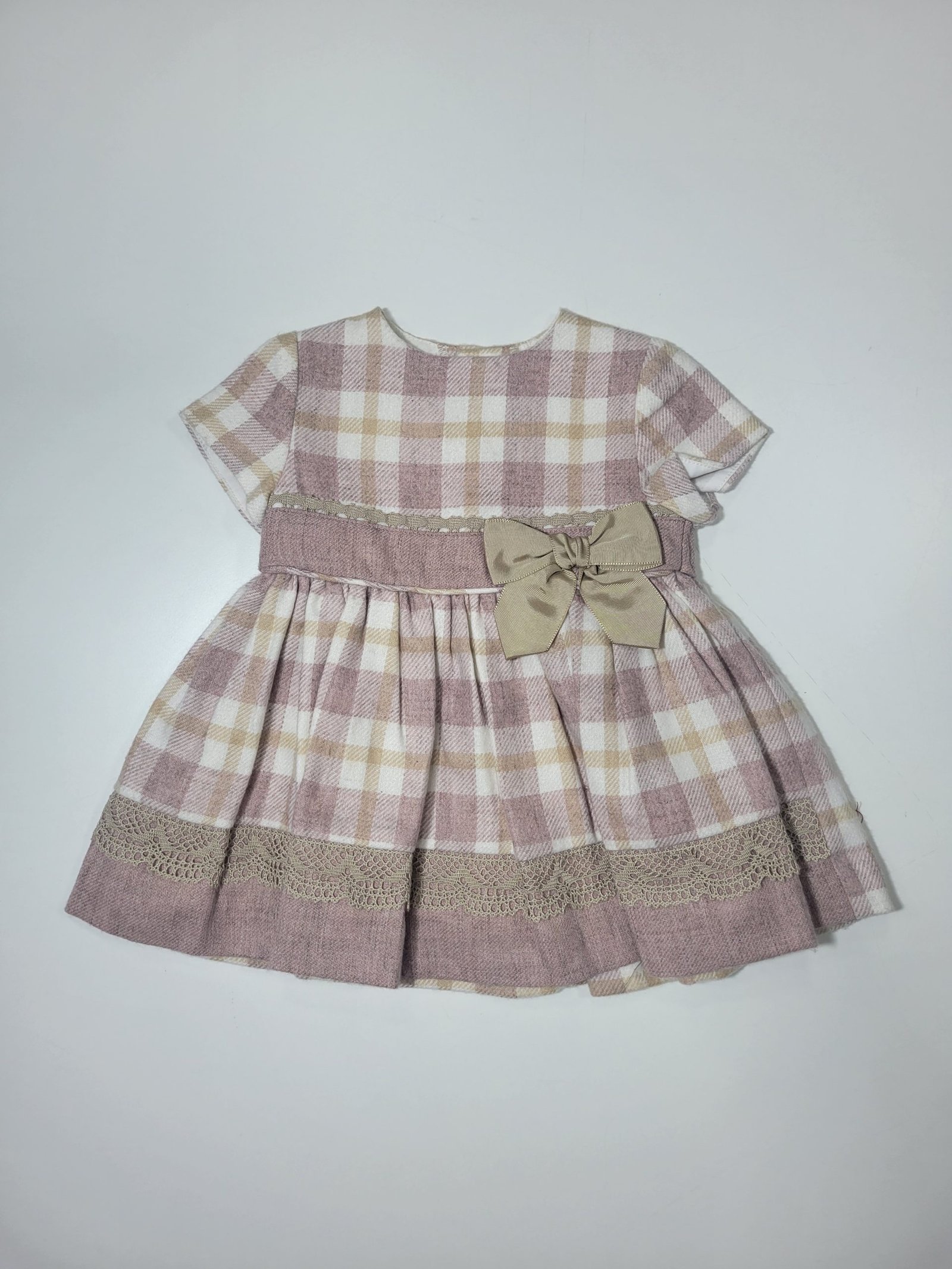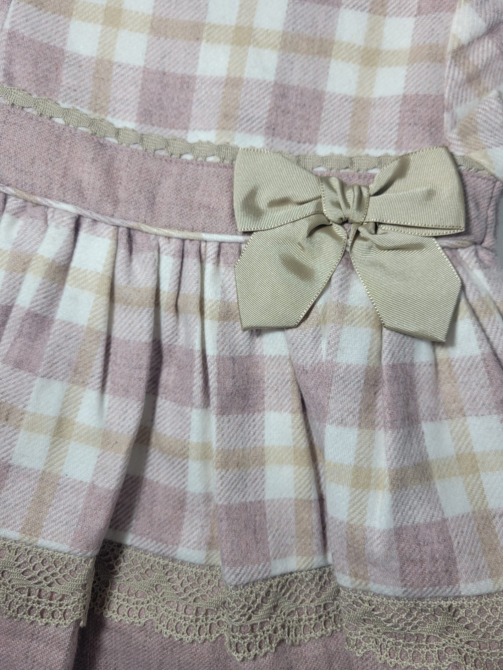 Design: Design cativante com padrão tricolor em xadrez, pequenos detalhes em renda e um laço na zona do peito