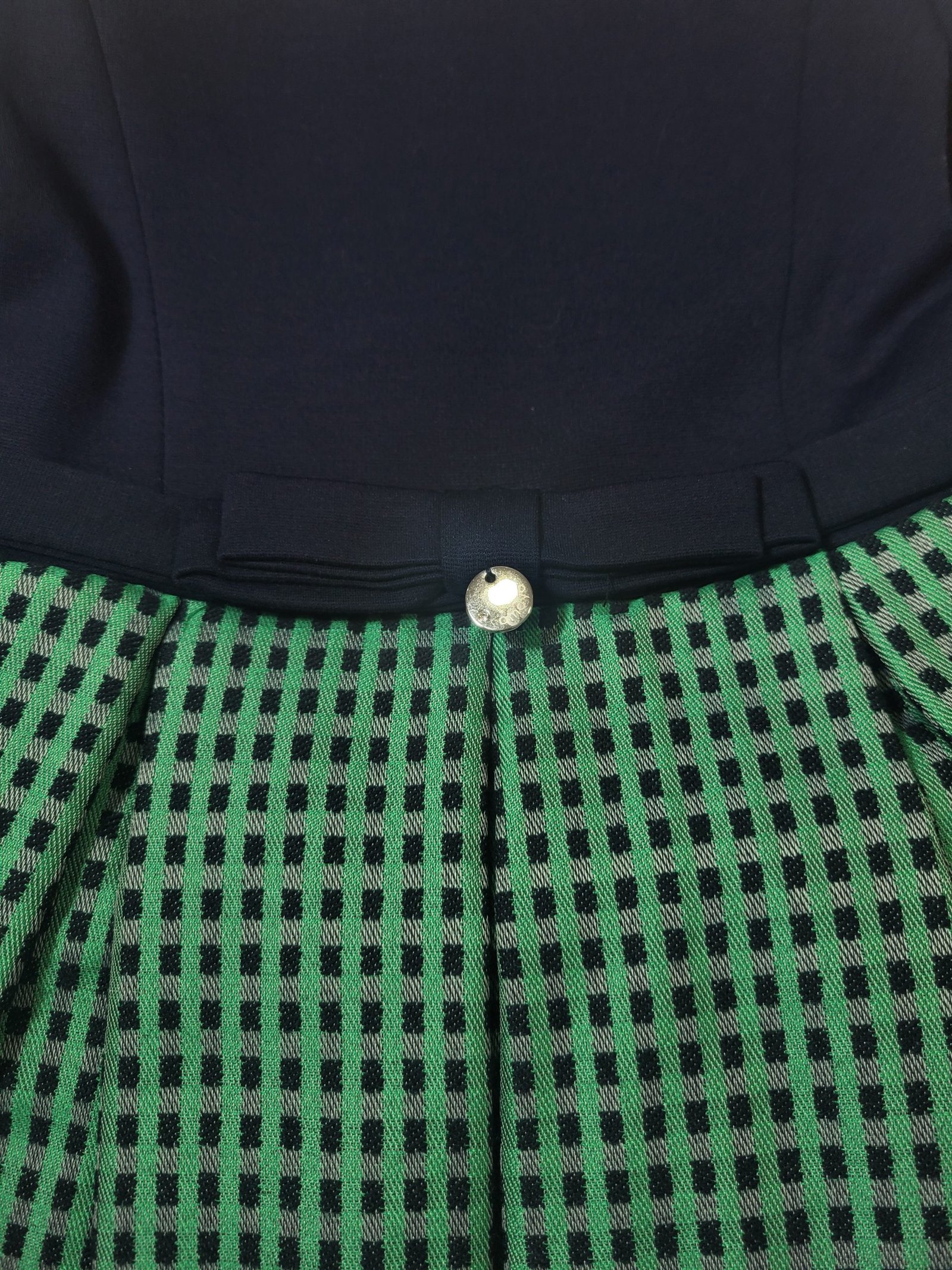 Design: Design requintado com padrão quadriculado, com faixa e laço discreto central